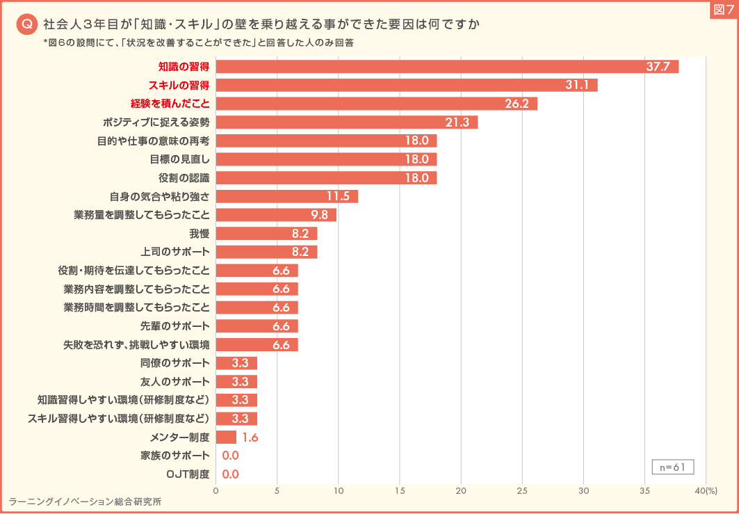 社会人3年目が壁を乗り越えることができた要因は、1位は「知識の習得」が37.7%とトップに。次に「スキルの習得」が31.1%、「経験を積んだこと」が26.2%と続きました。(図7)