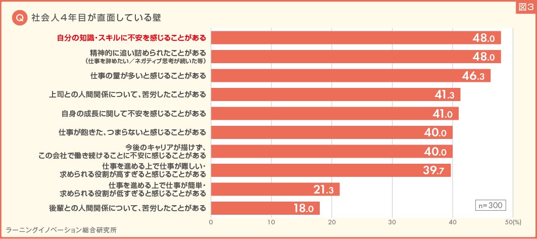 最後に、社会人4年目の結果では、「自分の知識・スキルに不安を感じることがある」と「精神的に追い詰められたことがある」が48.0%と同率になり、「仕事の量が多いと感じることがある」が46.3%と続きました。(図3)