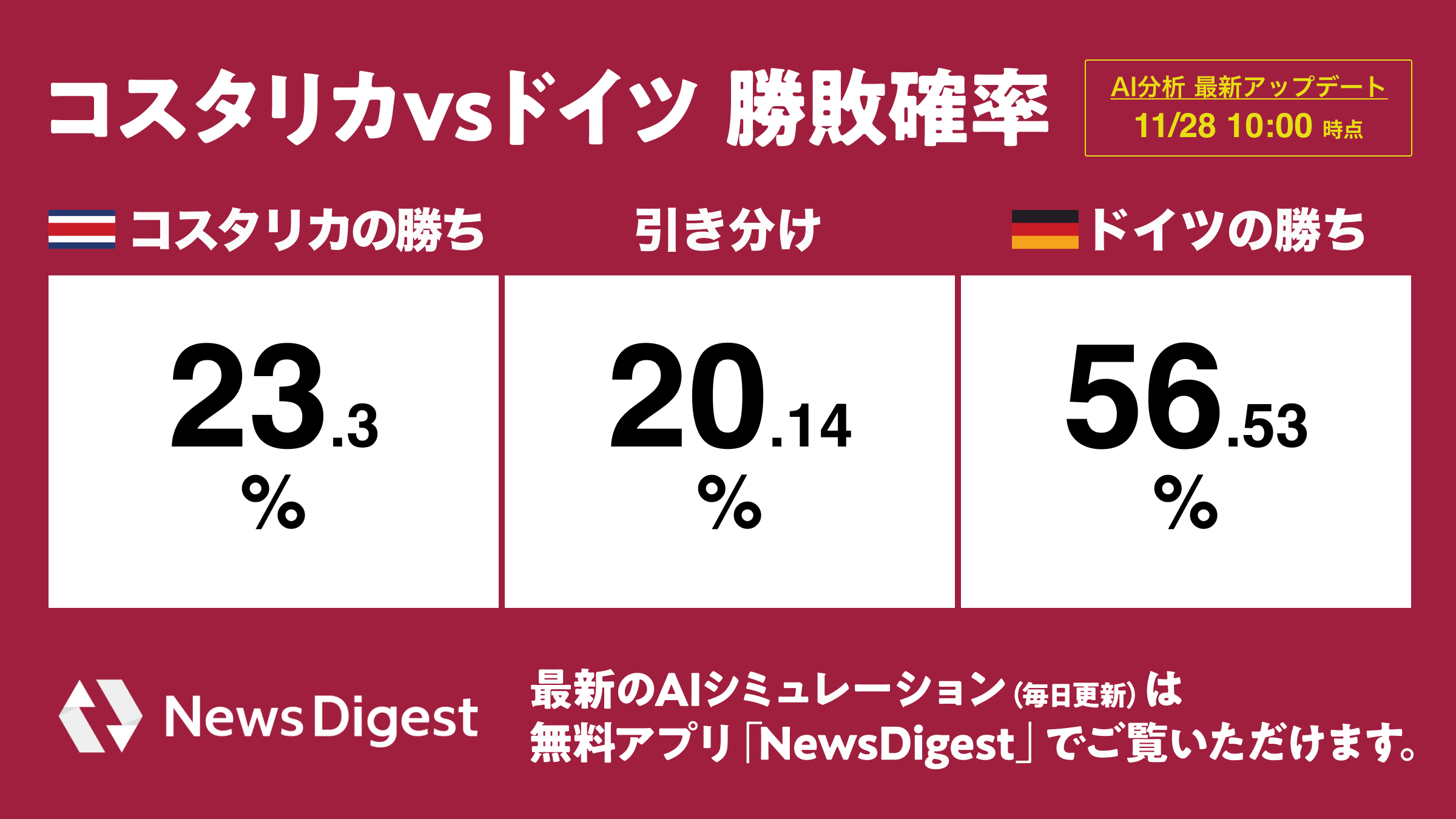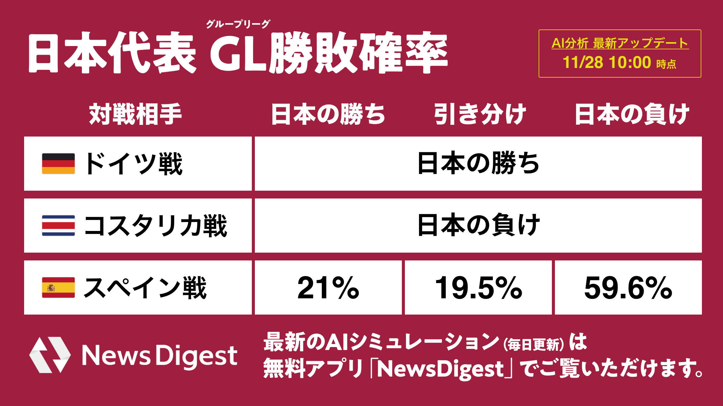 当社が開発したAIを利用したシミュレーション(日本時間27日12時時点)では、日本対コスタリカ戦の日本の勝率を46.0%、日本がグループリーグを突破できる確率を70.8%と予想していました。