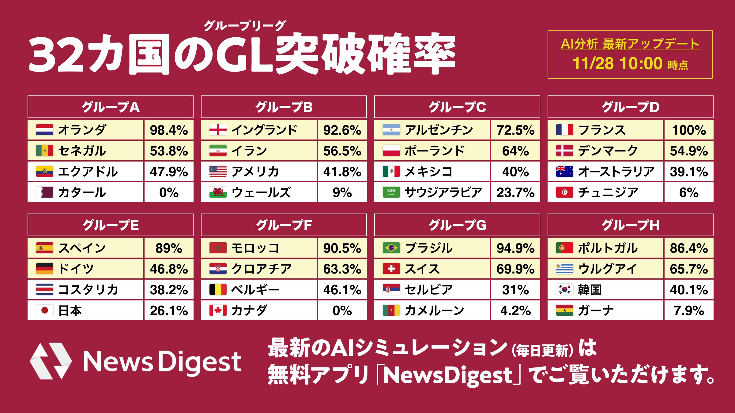 株式会社JX通信社(東京都千代田区/代表取締役 米重 克洋、以下 当社)は、11月20日からカタールで開催されているサッカーワールドカップにあわせ、AIを活用した独自の数理モデルを構築し、すべての試合結果を1万回シミュレーションしました。日本時間27日夜から28日早朝にかけて行われた試合の結果を受けて再シミュレーションした結果、日本代表がグループリーグを突破できる確率は26.1%であることがわかりました。