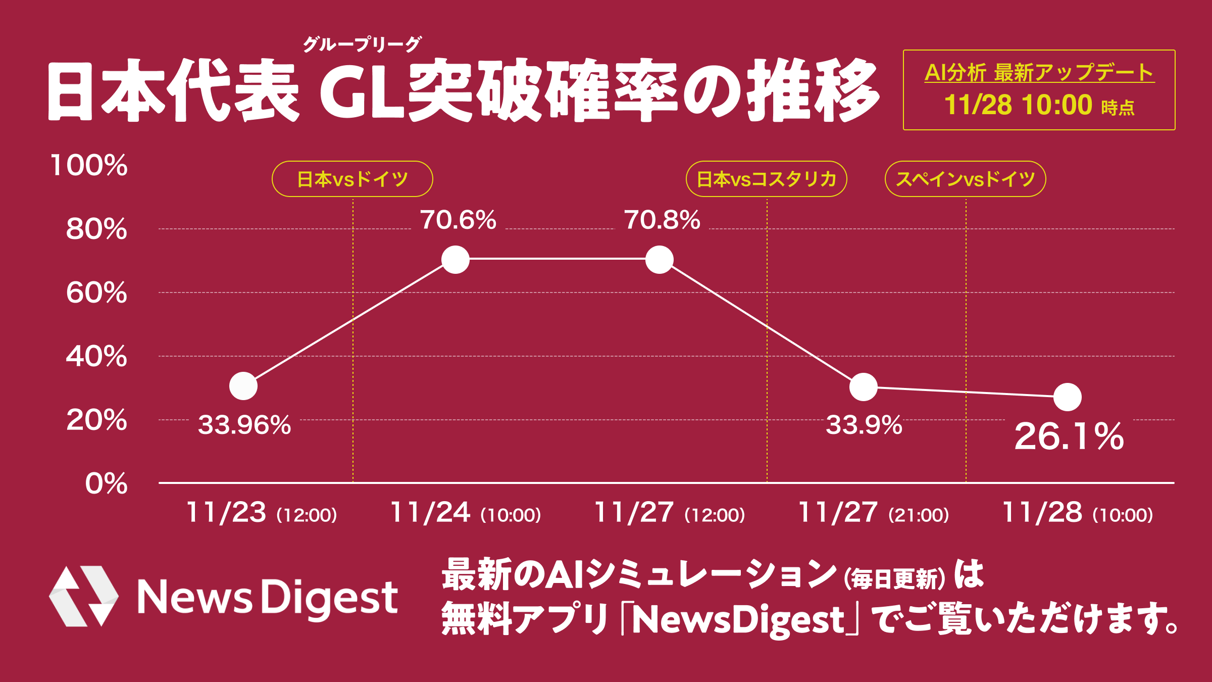 同19時から行われたコスタリカ戦で日本代表が敗北したことで、グループリーグを突破できる確率は33.9%まで下落。スペイン対ドイツ戦で引き分けたことで、突破確率はさらに26.1%まで下落しました。