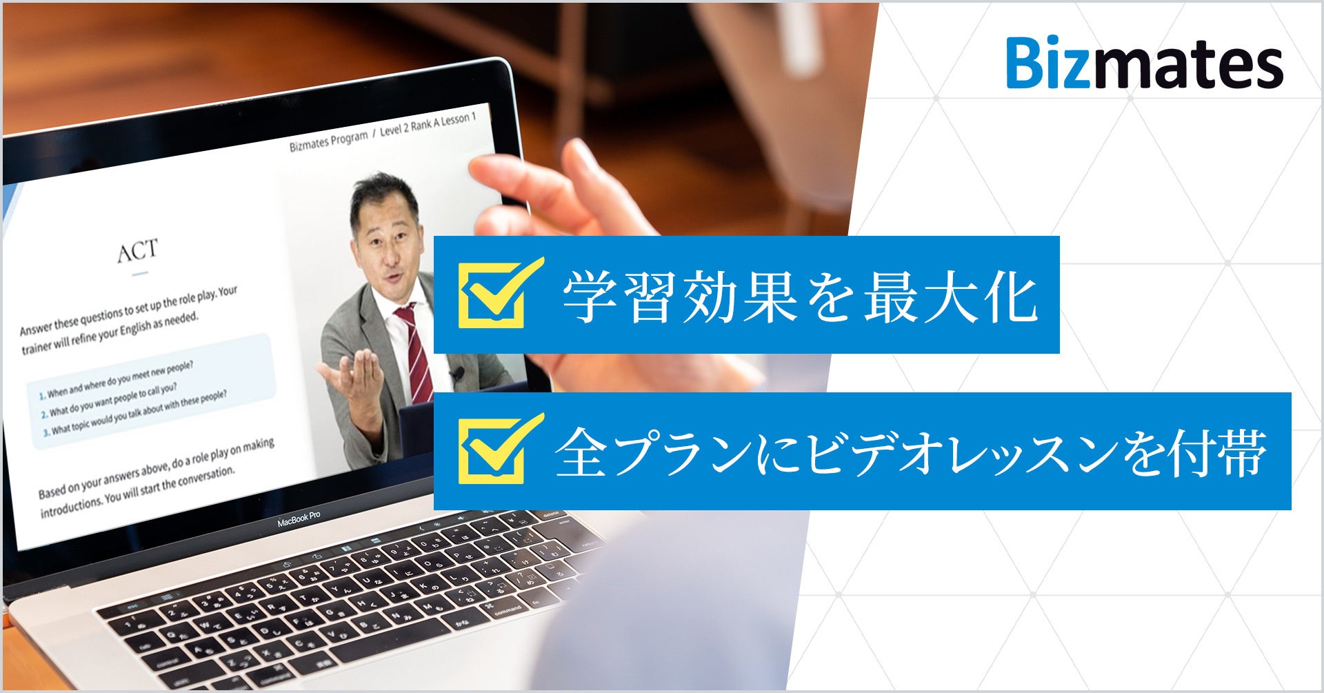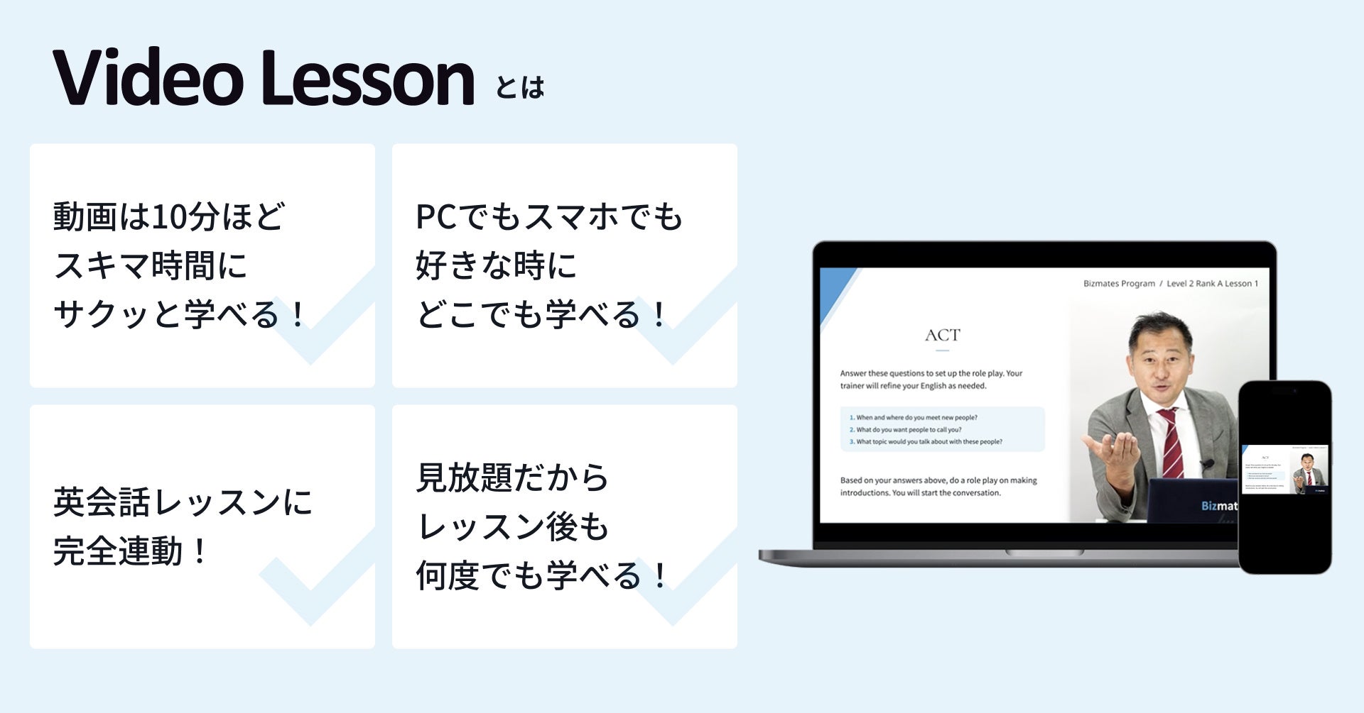 ビジネス特化型オンライン英会話事業「Bizmates」(以下「Bizmates」と言う。)(https://www.bizmates.jp/)を展開するビズメイツ株式会社(本社:東京都千代田区、代表取締役社長:鈴木 伸明 、以下「当社」と言う。)は、2024年5月8日(水)より、Bizmatesの全プランにVideo Lesson(以下「ビデオレッスン」と言う。)を付帯し、新プランに改定します。本改定により教材の予習・復習の機会を増やし、英語を効率的に学習できる環境を提供いたします。