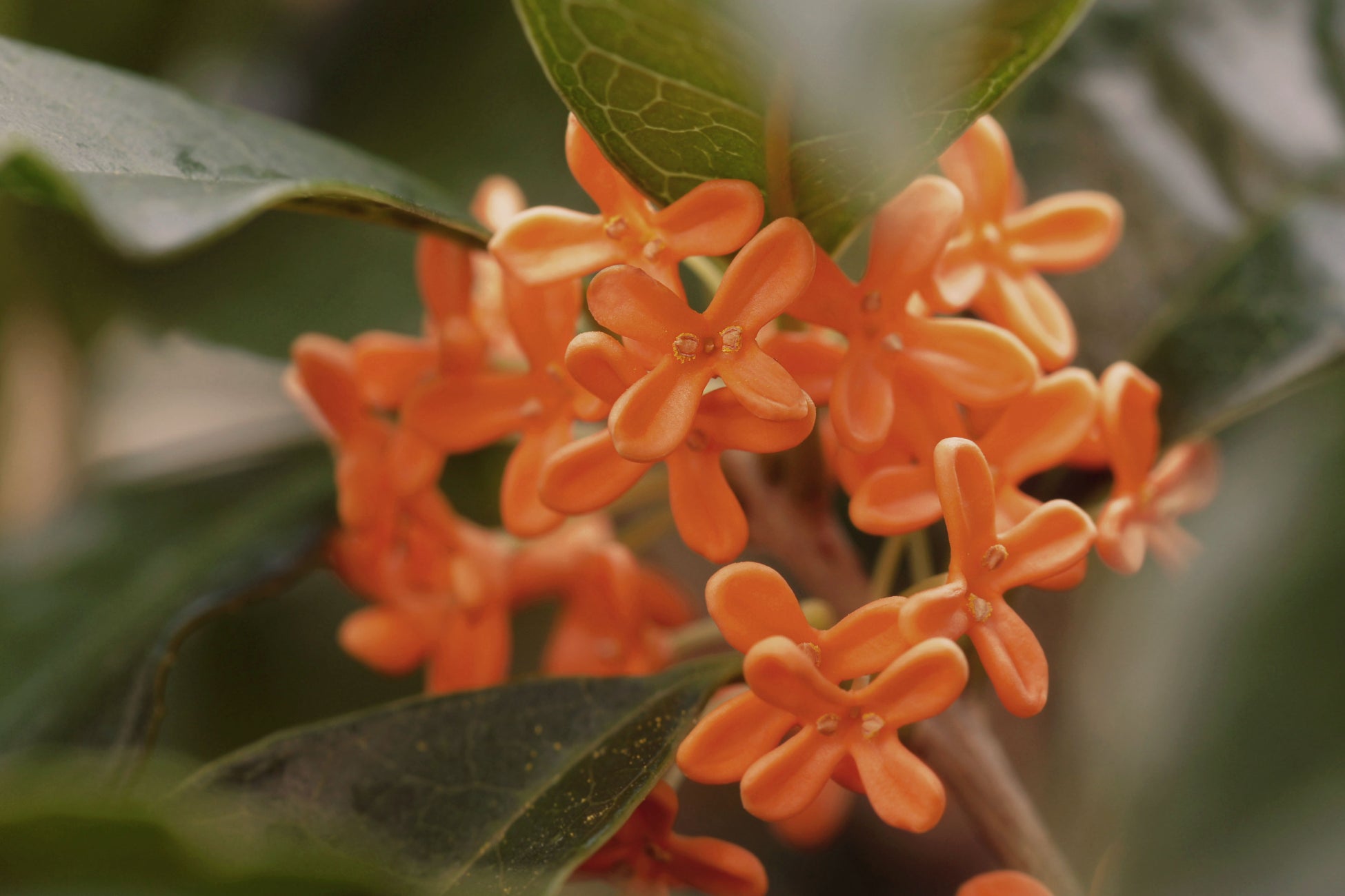 気候や環境によって咲き始める時期は前後しますが、キンモクセイは9月下旬から10月中旬ごろにかけて小さなオレンジ色の花を咲かせる常緑樹です。ギリシャ語の「osme(香り)」と「anthos(花)」が語源の「オスマンサス」は学名で、5メートル以上離れても香りを感じる香木の一種です。
