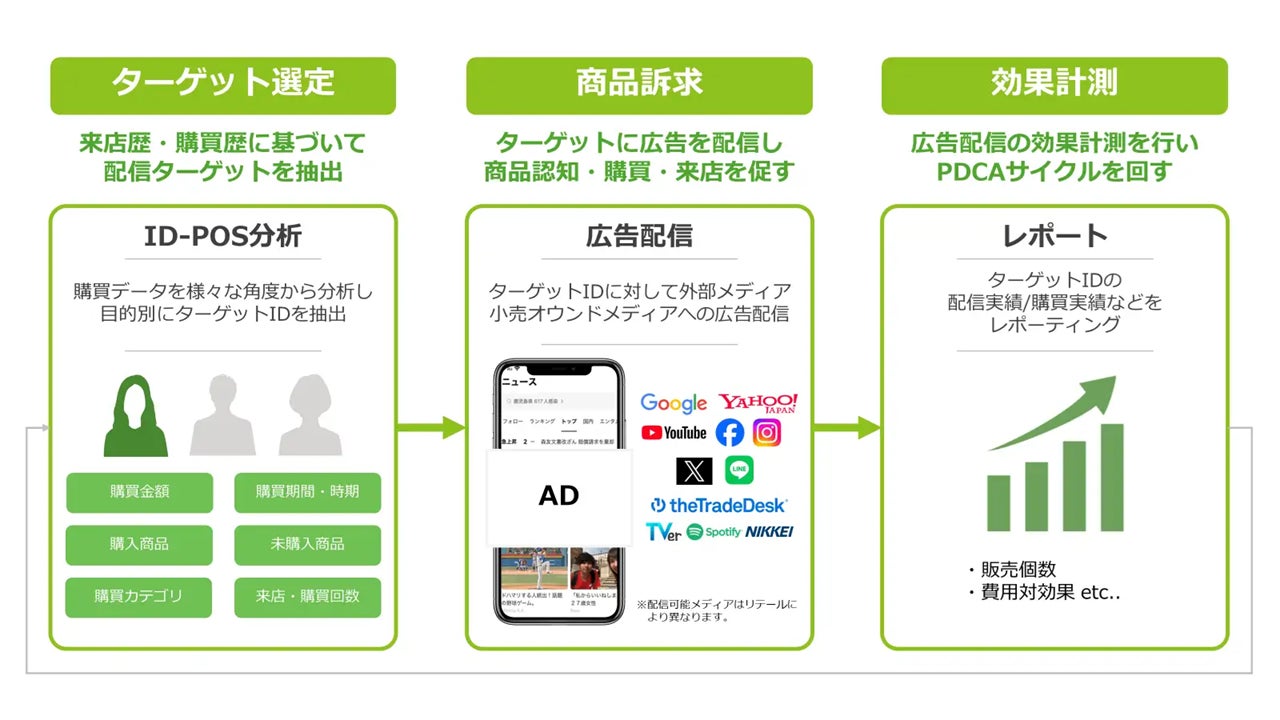 流通小売業様が保有する会員データやID-POSデータなどの購買行動データを分析し、オンライン・オフラインの顧客接点への広告配信や、Googleや各SNSなどデジタル広告と連携することで、消費行動に合わせた精度の高い購買ターゲティングやリアル店舗における購買検証が可能になります。