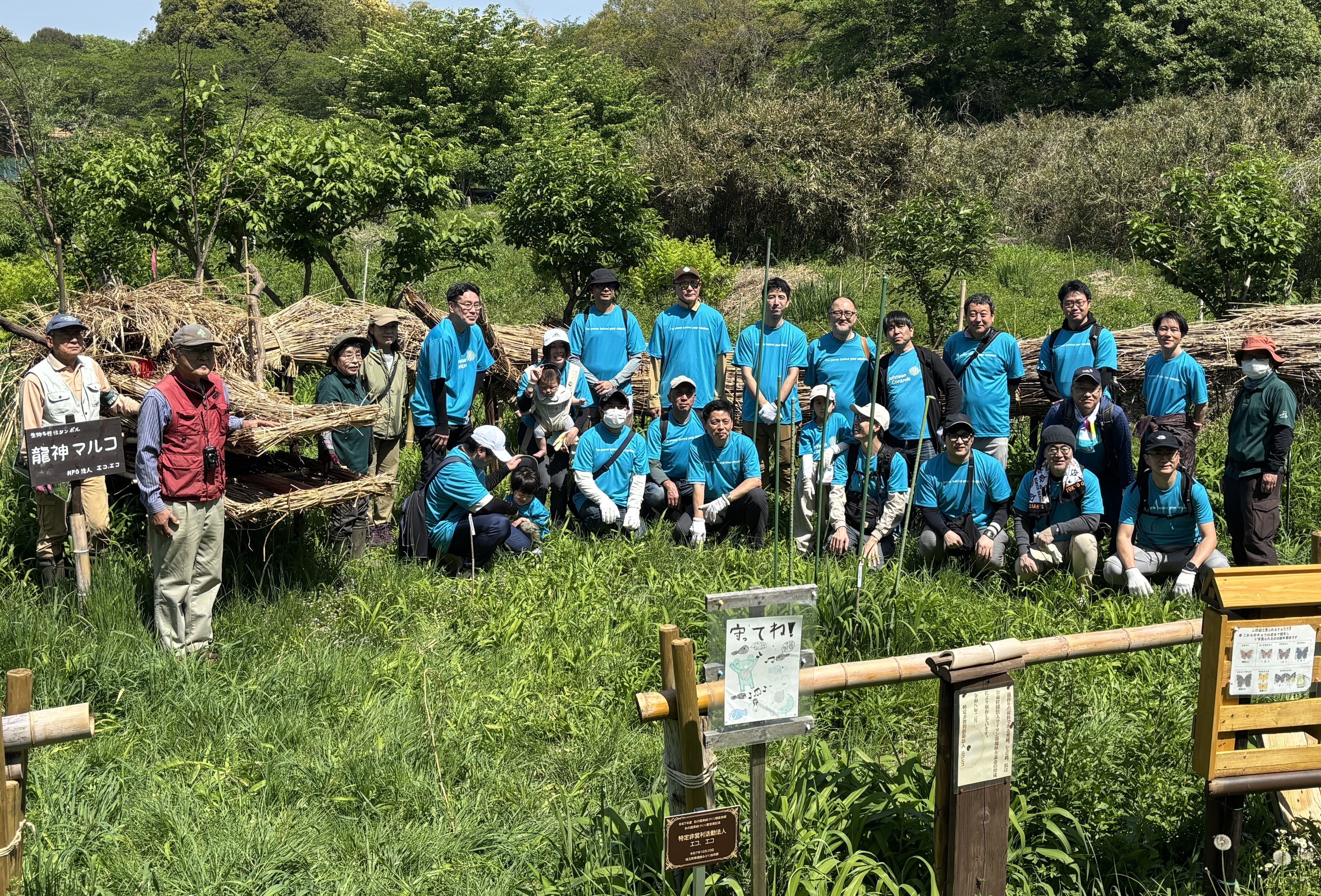 ジョンソンコントロールズではまた、毎年4月をアースマンスとしてサスティナビリティへの理解と行動を促す社内キャンペーンをグローバル全従業員を対象に実施しています。本キャンペーンは、当社の事業が果たす社会的役割を再確認するとともに、従業員一人ひとりの知識向上と主体的な参画を目的としています。日本法人では今年、自社ビジネスと関わりの深い気候変動対策に加え、地球のサスティナビリティのためにその重要性が指摘されている生物多様性保全についての理解を深め、両輪で推進することの重要性について学ぶことを目的に、公益財団法人 日本自然保護協会様の協力の下、「ネイチャーポジティブ」をテーマとしたオンラインセミナーを実施、約200名の従業員が参加しました。さらに、埼玉県の見沼田んぼにて実際に里山保全活動を体験、代表取締役社長の松下太郎をはじめ、複数の執行役員が従業員やそのご家族と里山の自然の中汗を流しました。