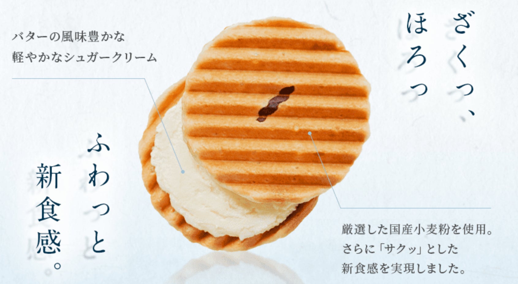 千寿せんべいの一番の要となる“千寿せんべい専用粉”のブレンドを調整し、従来とは異なる「ふんわりと軽い食感」と「口ほどけの良さ」を実現させる開発を意識しました。今回新開発の“プレミアム千寿せんべい専用粉”の開発を着手した際に、総数50以上のバリエーション違いの千寿せんべいを作成し、改良を重ねました。その結果、生地に風味高い“バター”と粒の大きさにこだわった“ザラメ糖”を練りこむことで、より一層の「口ほどけ」の良さとザクザク食感を楽しんでいただける千寿せんべいの生地が仕上がったのではないかと思います。さらに、生地をより活かすために、クリームには練乳を新たに配合。従来よりも濃厚でより一層香り深い味わいに仕上げました。