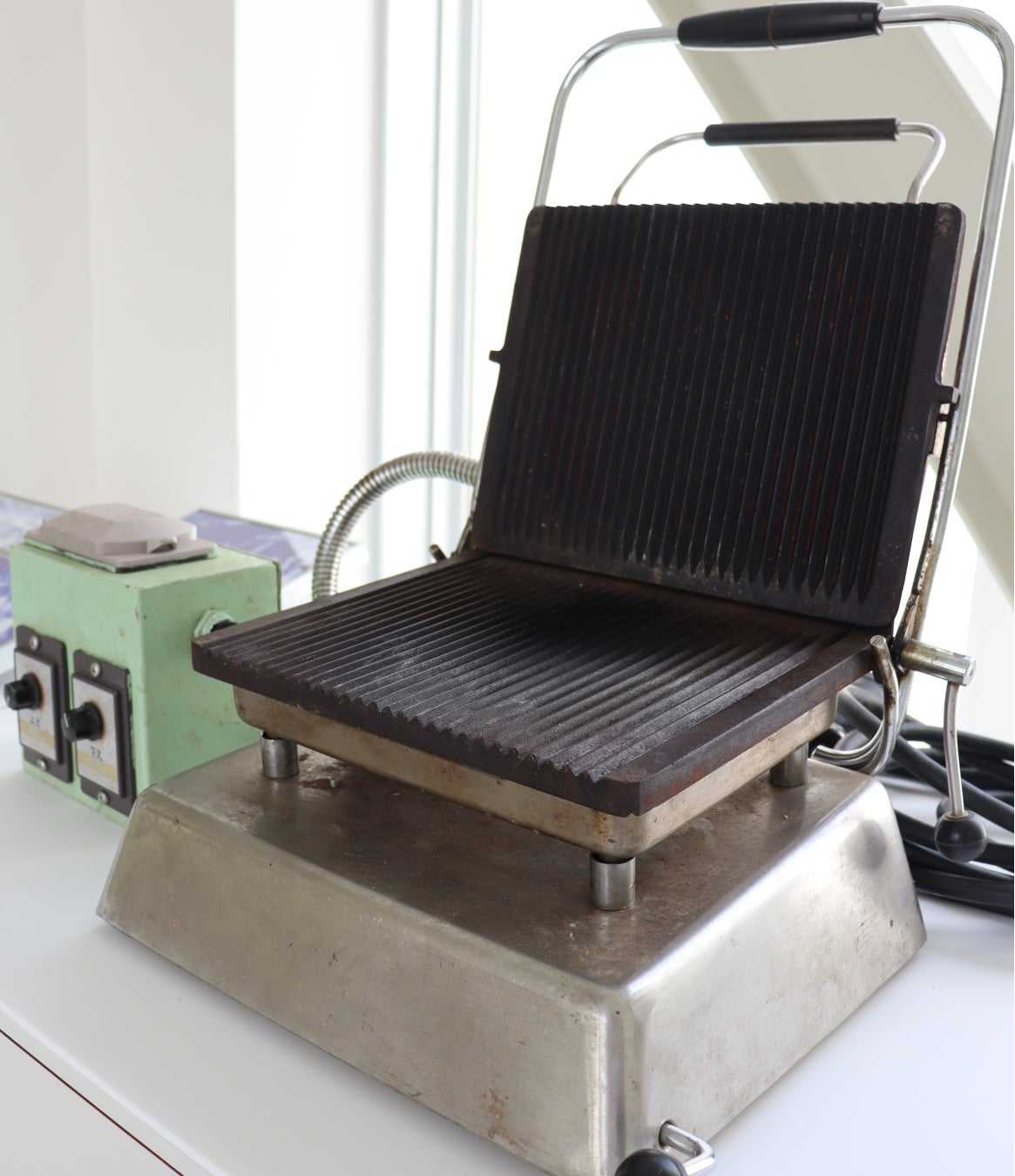 新商品開発時に当時の製菓雑誌に載っていた機械を購入したところ、間違えてドイツ製の焼肉製造機を購入してしまいます。