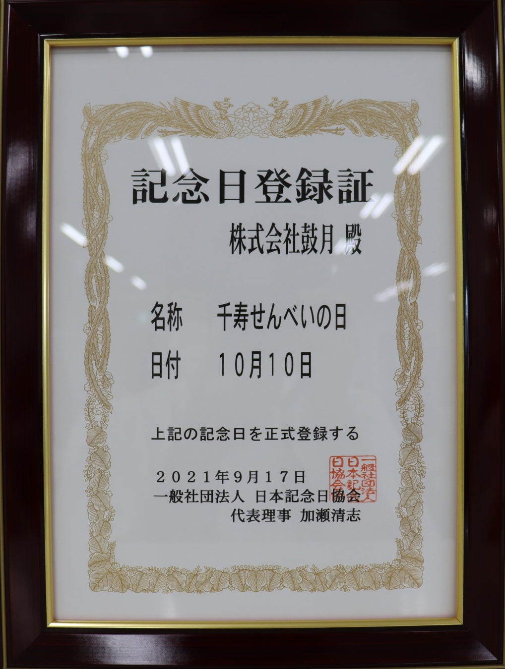 この日をきっかけにより多くの方に千寿せんべいを楽しんでいただきたいという想いから、2021年10月10日に一般社団法人日本記念日協会にて【10月10日 千寿せんべいの日】に制定いたしました。