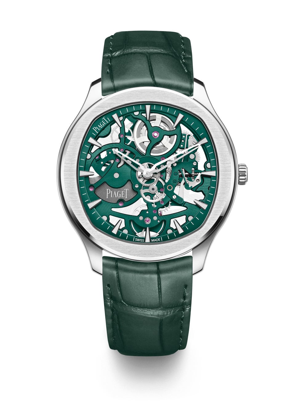 スケルトンの建築的なラインを際立たせる、生命力あふれるグリーン。文字盤やムーブメントを極限まで削ぎ落とし、ウォッチの心臓部を披露するスケルトン構造ほど、精巧なムーブメントの動きを楽しめるものはありません。デザイン性と機能性を併せ持つスケルトンウォッチの製造には、卓越した職人の技術と経験が必要とされます。それこそが、半世紀以上に渡りピアジェが培ってきたサヴォアフェールの真髄なのです。