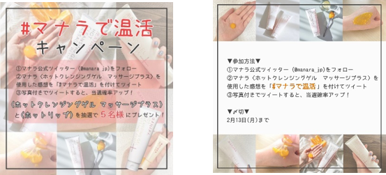 賞品 :参加条件を満たした人の中から抽選で5名の方にマナラ〈ホットクレンジングゲル マッサージプラス〉