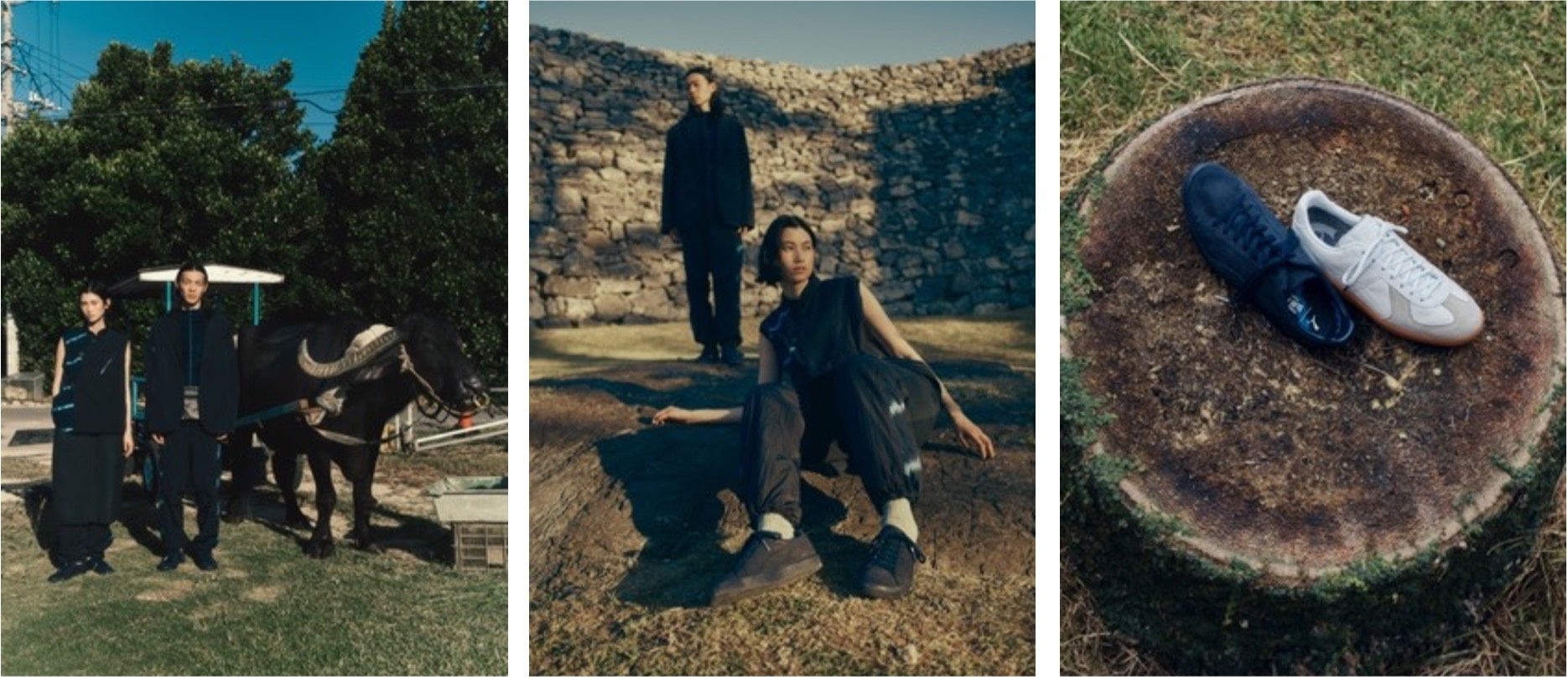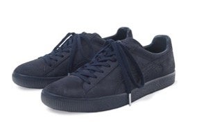 シューズは、プーマのアイコニックなシルエットであるPUMA CLYDEとARMY TRAINER(アーミートレーナー)をベースに、両ブランドの特徴を併せ持つ2モデルを展開します。CLYDEのアッパーには、日本製のワックススウェードを採用し、プーマアーカイブの伝説的な作品を上品な質感で表現しています。ディテールには、BLUE BLUE JAPANのシグネチャーの1つである“絞り染め”がシューズのライニングとシューレースにあしらわれ、ブランドのシンボルである「ARIGATO(ありがとう)」の文字がシューレースのメタルトップに刻まれています。デザイン性に富んだ絞りの存在感や服飾技術は、四季折々の自然が育んだ豊富な素材によって創り出されています。ARMY TRAINERには、ホワイトとグレーのカラーをベースに「GORE-TEX(ゴア テックス)」を搭載し、美学と機能性を両立させたミニマルな美しさが特徴です。インソールには、サクラをモチーフにした“キリエサクラ柄”のデザインを施しています。