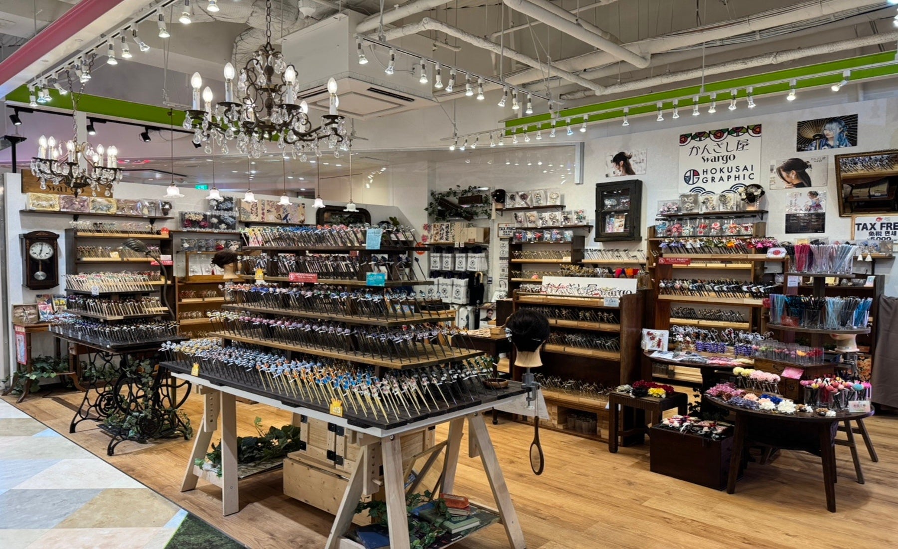 特長:国内外から観光客が集まる福岡の人気商業施設内。旅行の記念やギフトにも喜ばれる華やかなかんざしが多数揃い、幅広い年齢層に人気。