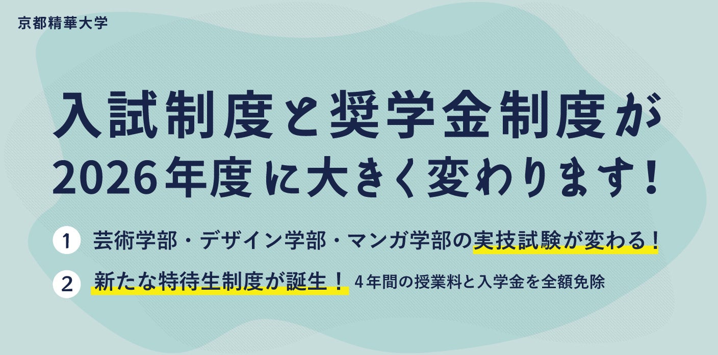 このたび京都精華大学(京都市左京区、学長:澤田昌人)では、多様な受験生の才能を引き出し、より多くの学生に学びの機会を提供するため、2026年度入試科目の改定と特待生制度を新設することを決定しましたのでお知らせいたします。