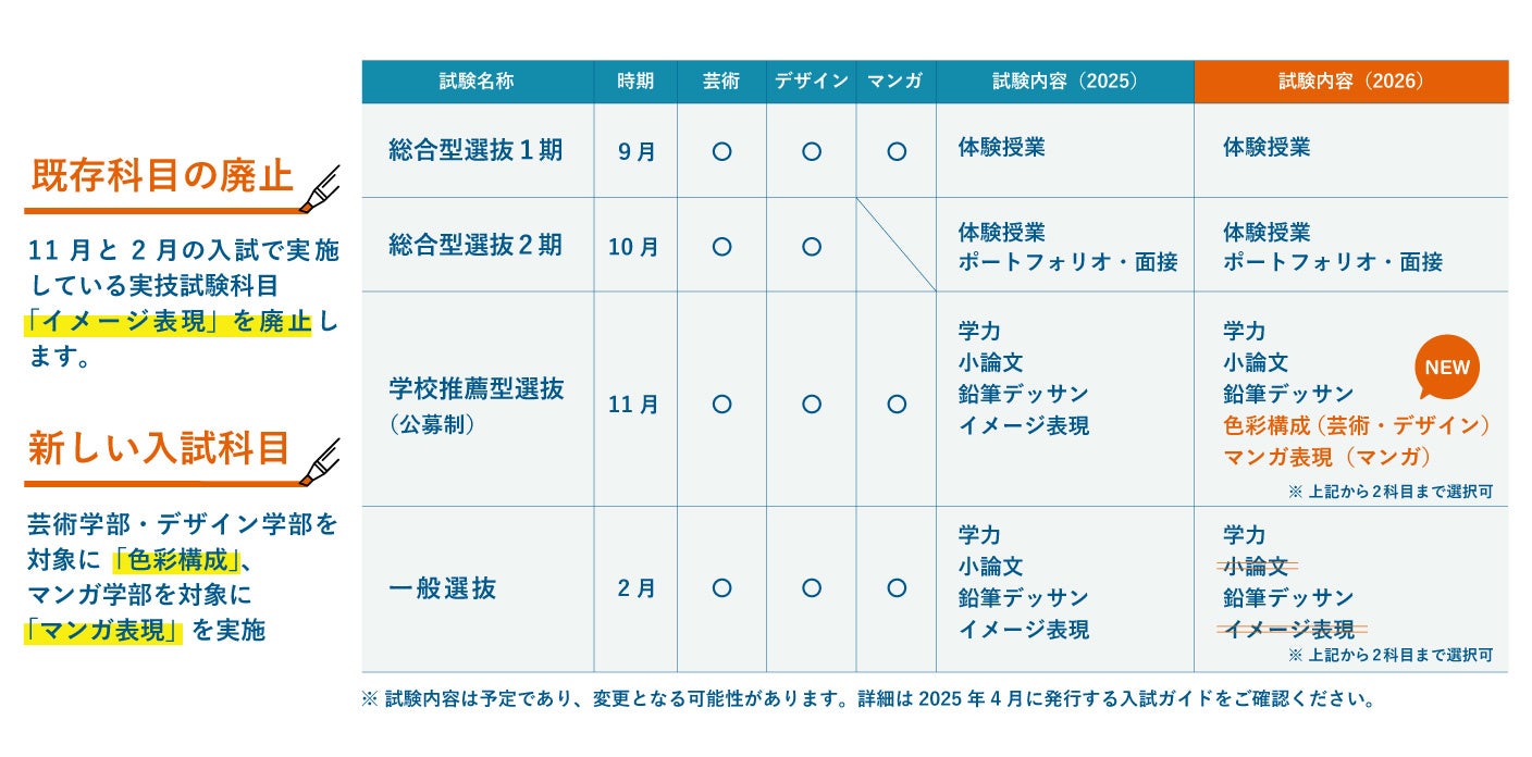芸術学部、デザイン学部、マンガ学部の実技試験が大きく変わります。