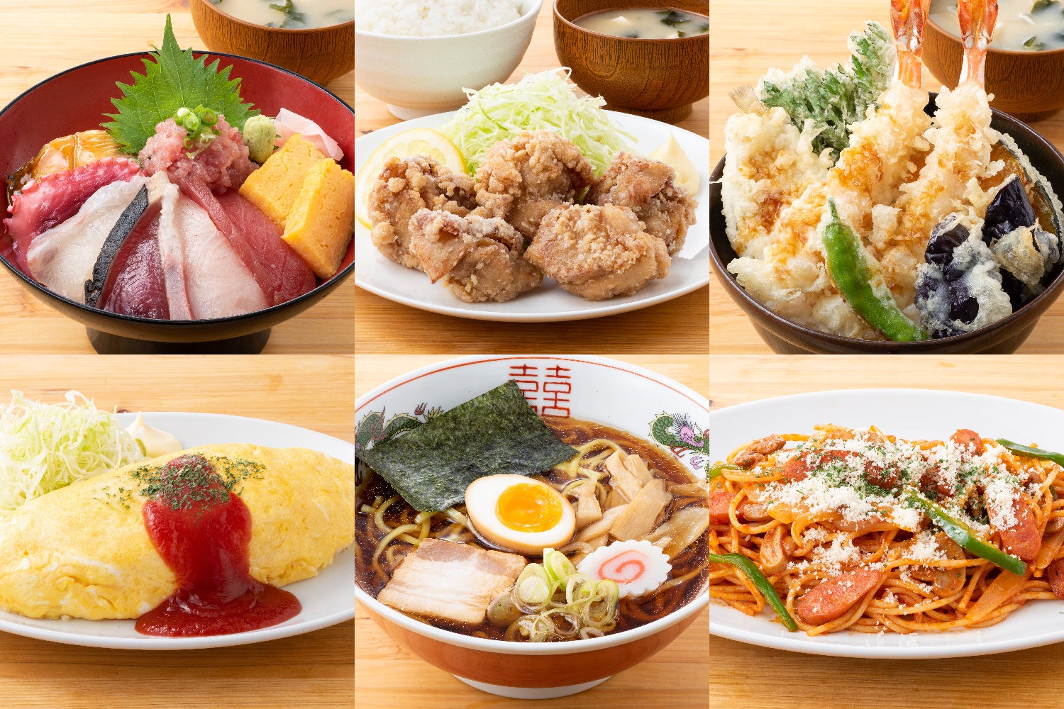 メニューは「鶏唐揚げ定食(680円)」「肉野菜炒め定食(750円)」「海鮮丼(950円)」「親子丼(800円)」「天丼(950円)」といった定食や丼ものはもちろん。「焼飯(700円)」「オムライス(850円)」「屋台ラーメン(650円)」「日替スパゲッティー(750円)」など、ボリューミーでコスパ良し、和洋中バラエティ豊かなメニューがズラリ! 毎日訪れても満足できます。