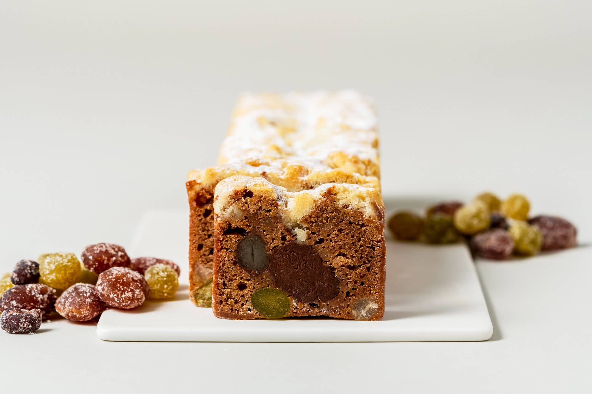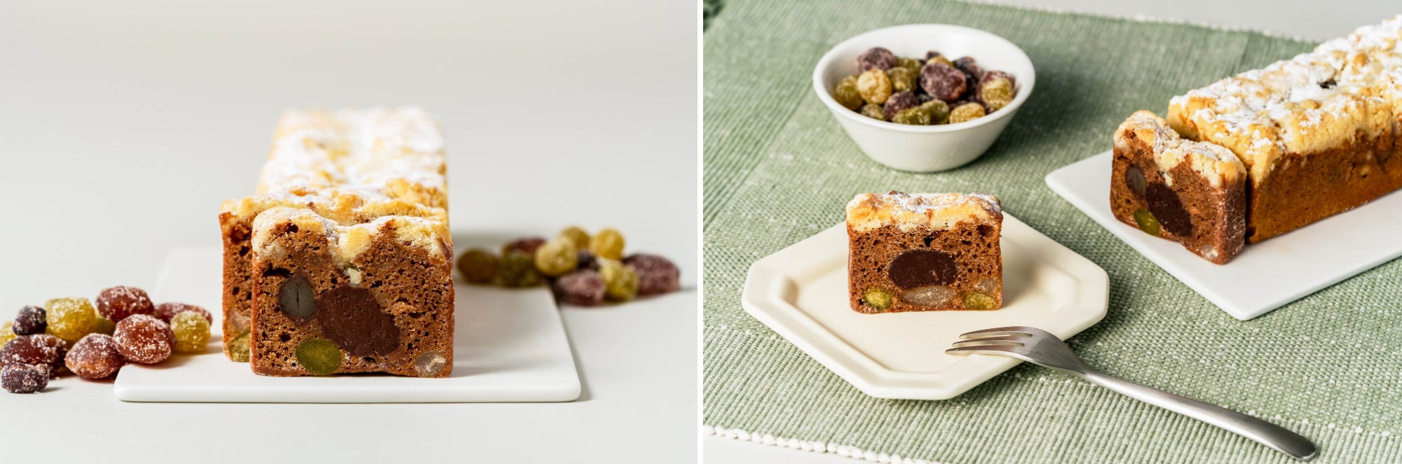 青えんどう豆・手亡豆・ひよこ豆・金時豆・白花豆の5種類の甘納豆を混ぜ込んだ生地には、甘納豆の優しい味わいに寄り添うハイチ産カカオ豆を使ったココアパウダーを使い、味わいに深みをもたせ、しっとりとした食感に仕上げました。