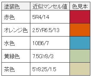 (赤色・オレンジ色・水色・黄緑色・茶色)