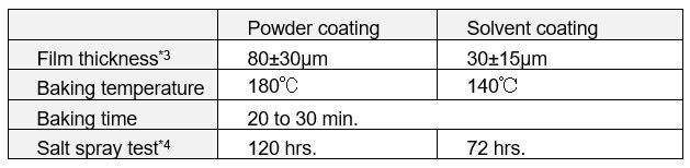 (粉体:180℃ 20分焼付時、60±5μm、溶剤:100℃ 20分焼付時、25±5μm)