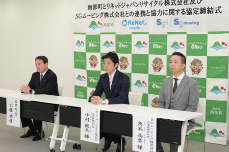(左から)青森県南部町 工藤町長、リネットジャパンリサイクル 中村社長、SGムービング 角本社長