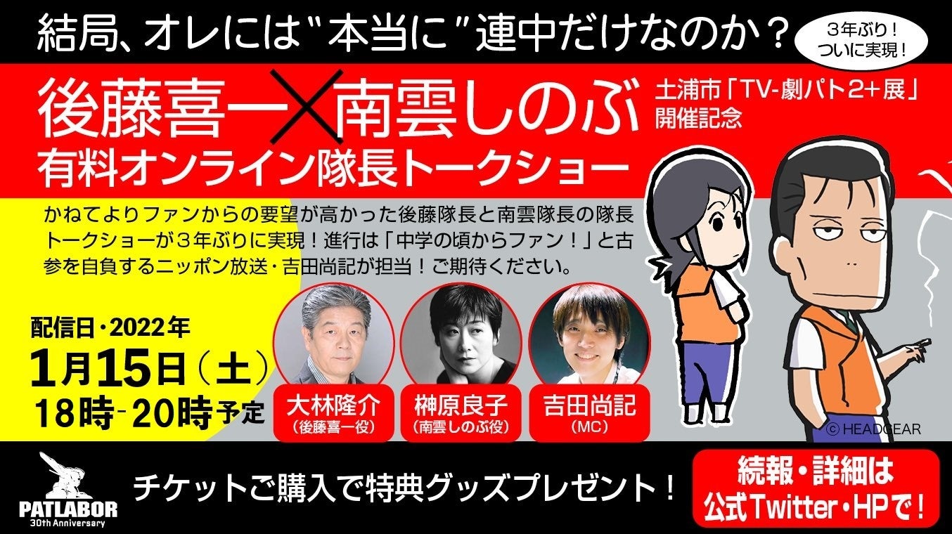 本展示会に合わせて、1月15日(土)18時より声優の大林隆介氏(後藤喜一役)、榊原良子氏(南雲しのぶ役)をお迎えした有料オンライントークイベントを実施致します。MCは本作の大ファンであるニッポン放送の吉田尚記アナウンサーが務めます。