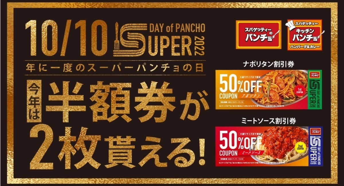 【年に1度の還元祭】10/10(月)はスーパーパンチョの日2022!『パンチョ』ご注文の方に次回使用できる「ナポリタン&ミートソース半額券」×2枚をプレゼント!