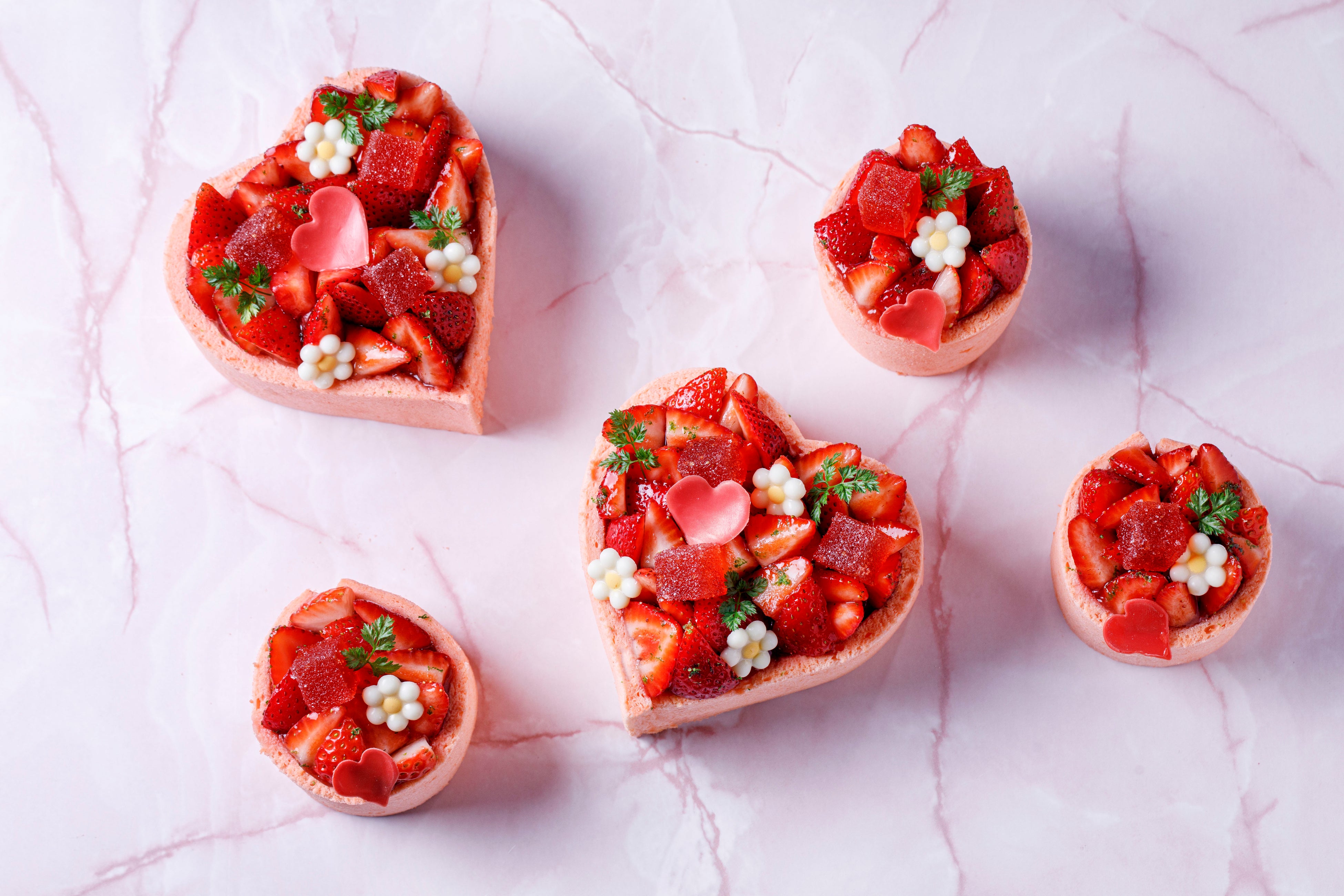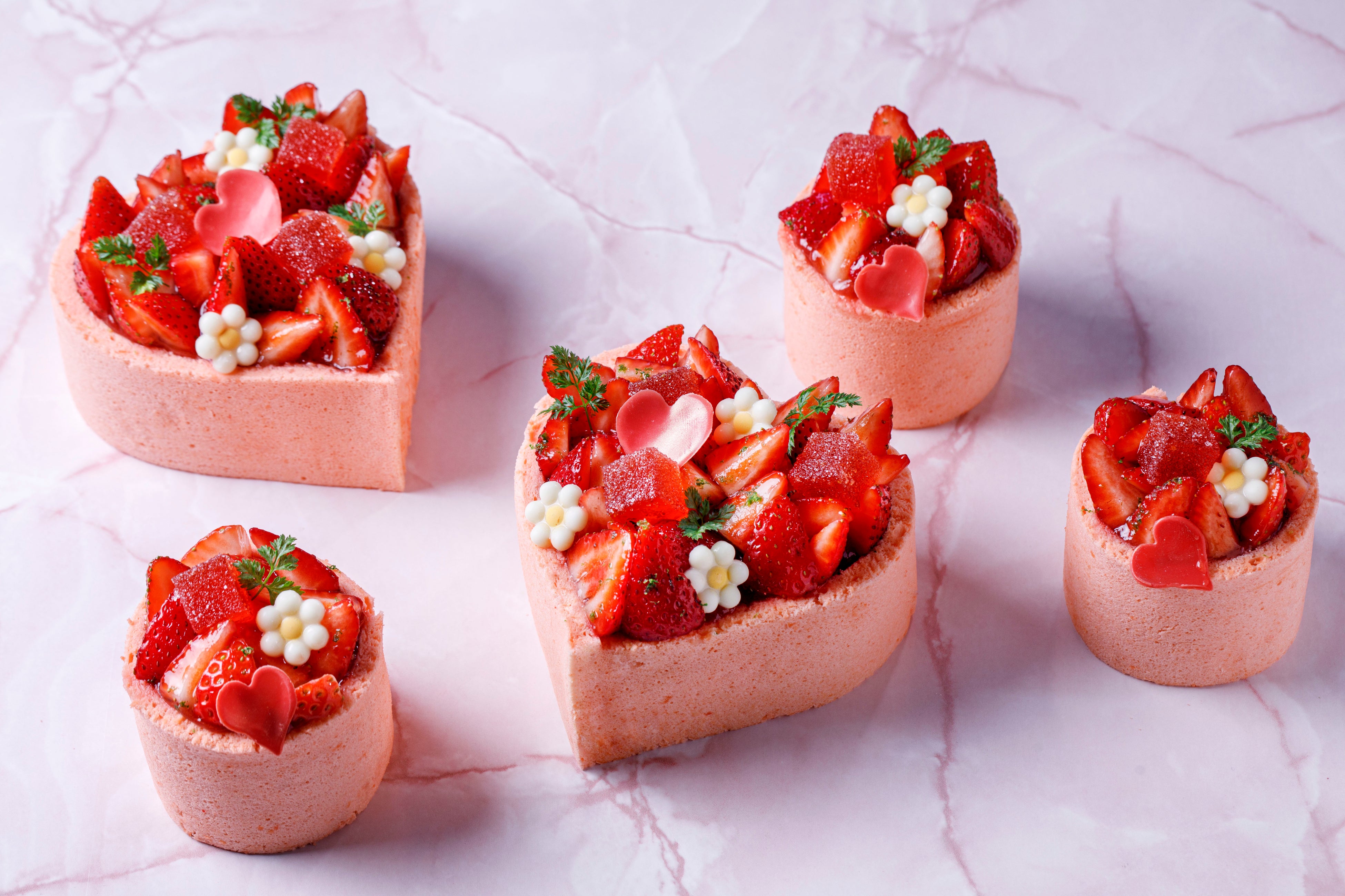 優しいピンクのスポンジに、スダチが香るバニラクリーム、果実の味わい豊かなストロベリージャムをあわせ、ヘーゼルナッツクランブルで食感の違いもプラス。フィリングの軽やかな甘みが、ふんだんにあしらったフレッシュな苺のみずみずしさを引き立てます。ハートシェイプのほか、円形のプティガトーもご用意しており、大切な方への贈り物やご自身へのご褒美スイーツにもおすすめです。