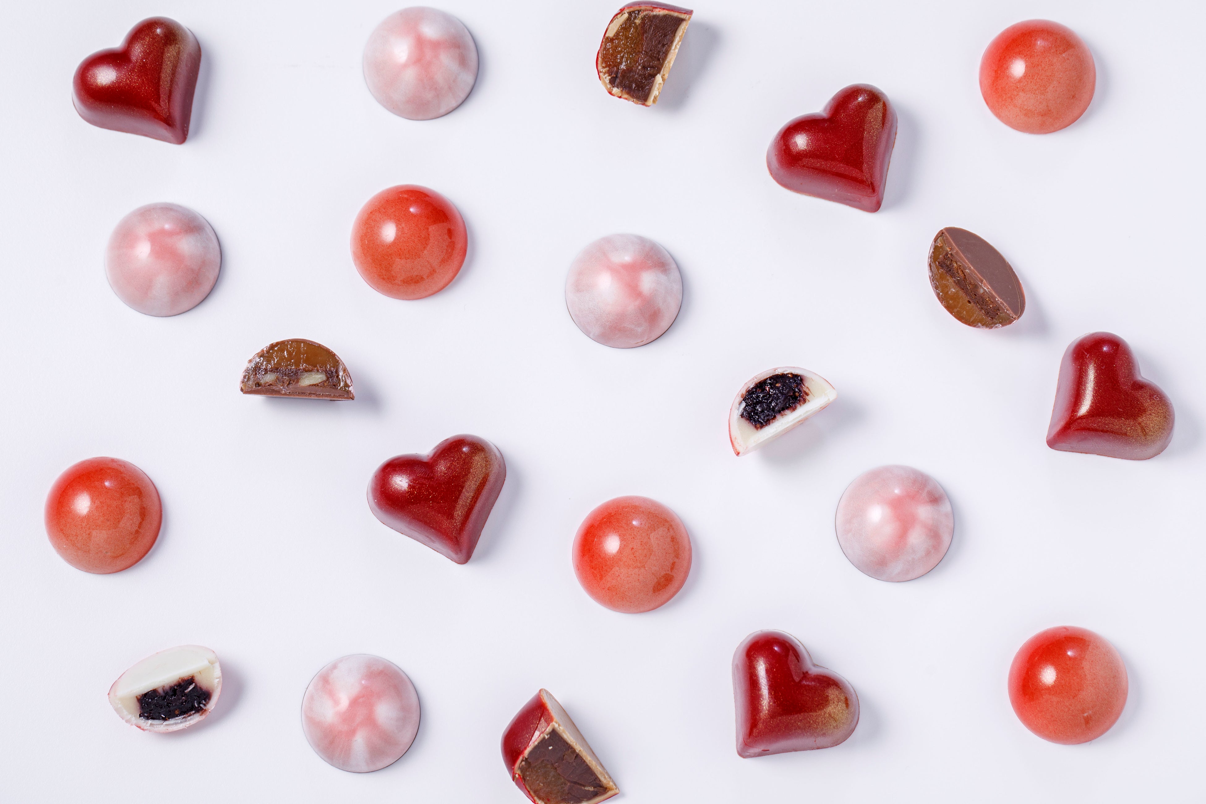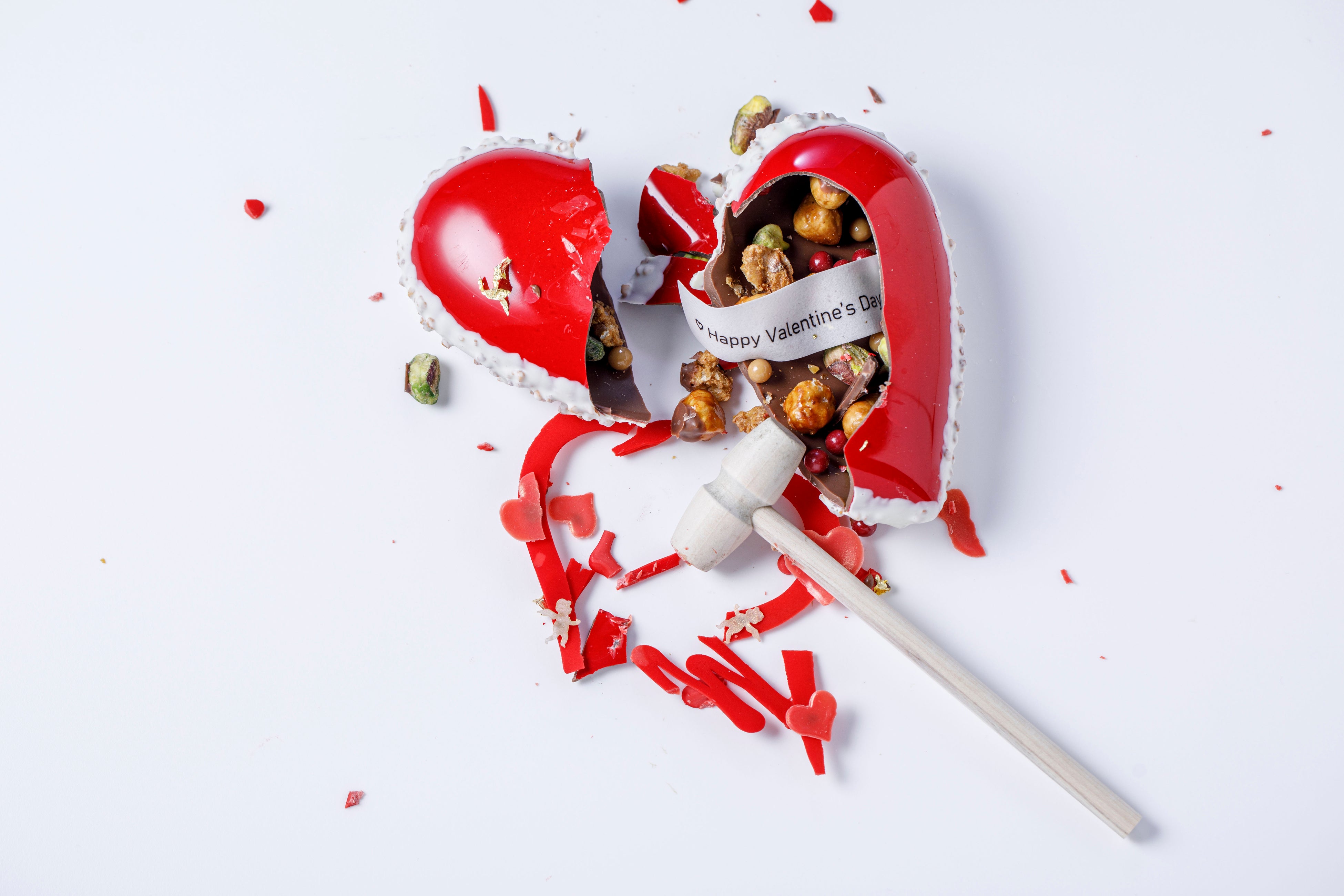 鮮やかな真紅のハート型チョコレートは、心臓の鼓動を描いたポップなデコレーションが印象的な1品。木製ミニハンマーで割るアクションも楽しみながら、中から出てくるヘーゼルナッツ、メープルピーカンナッツ、ピスタチオ、パールチョコレートなどとあわせてご賞味ください。ご希望によりメッセージを入れ、ビジュアル通り、胸が高鳴るサプライズを演出することも。