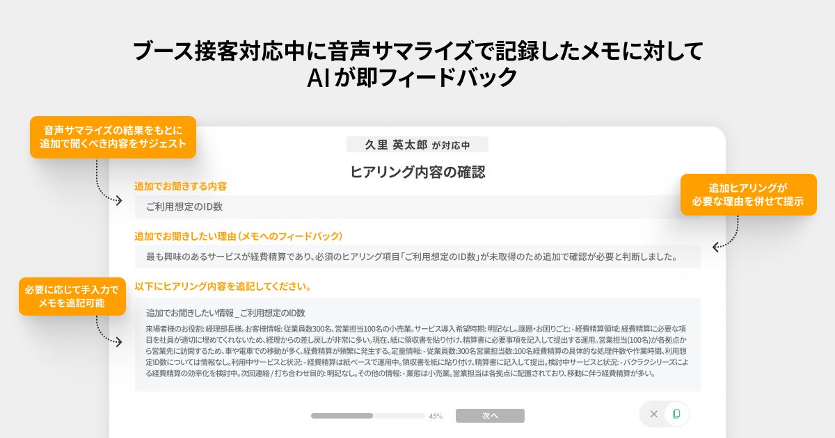 AIマジックの主要機能の一つである音声サマライズは、PCやタブレットなどで録音した音声データをAIが自動的に要約し、業務オペレーションに合わせた形式で出力する機能です。展示会の接客対応で音声サマライズを活用することによって、出力された記録の確認だけで接客メモの入力を完了できるようになります。従来発生していたヒアリングフォームへ手入力する作業が自動化され、展示会において最も重要な「顧客対応」に集中できる体制を実現します。