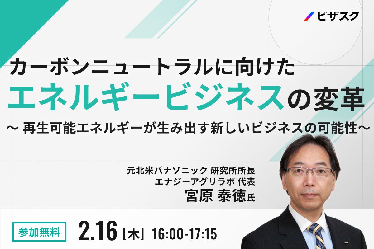 「知見と、挑戦をつなぐ」をミッションにグローバルなナレッジプラットフォームを運営する株式会社ビザスク(以下、当社)は、「エネルギー産業の現状と新しいエネルギービジネス創出の秘訣」をテーマに、エナジーアグリラボ代表である宮原 泰徳氏のご登壇による無料オンラインセミナーを、2/16(木)16時より開催します。