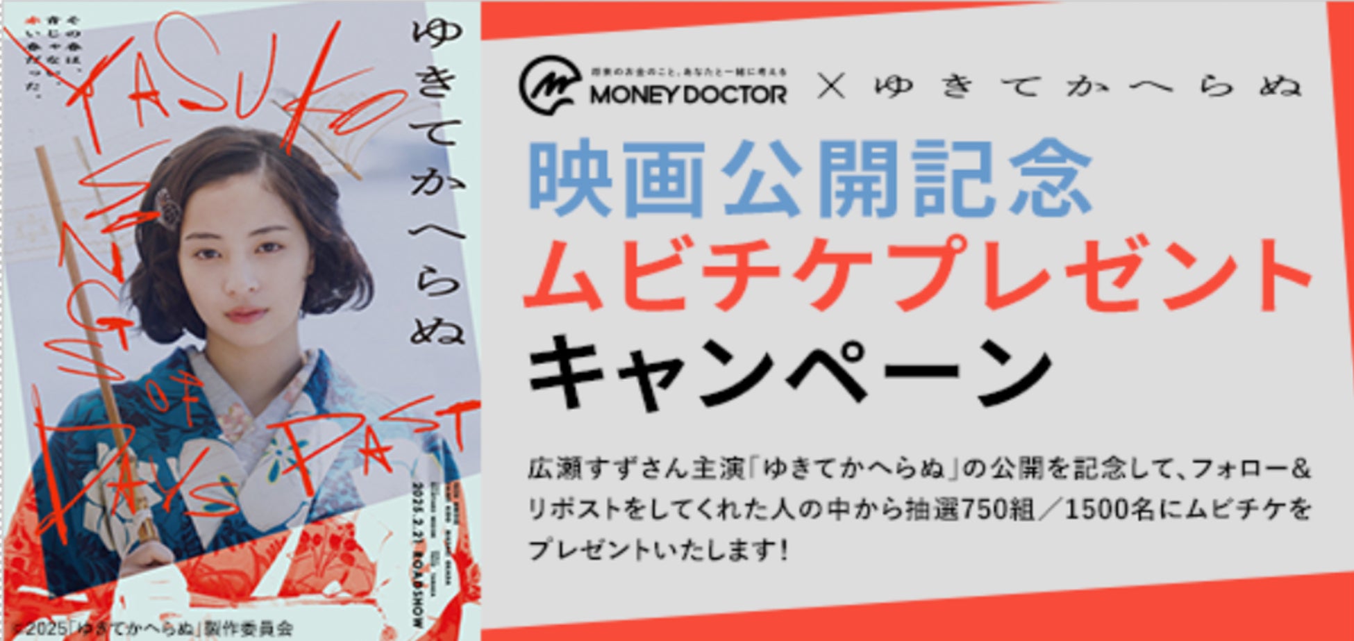 無料FP相談サービス「マネードクター」を運営する株式会社FPパートナー(本社:東京都文京区、代表取締役社長:黒木 勉、証券コード:7388、以下「当社」)は、マネードクターのCMキャラクターを務める俳優の広瀬すずさんが主演する映画「ゆきてかへらぬ」とのタイアップキャンペーンを2025年1月10日(金)から開催いたします。映画「ゆきてかへらぬ」は2月21日(金)よりTOHOシネマズ 日比谷ほか全国公開です 。