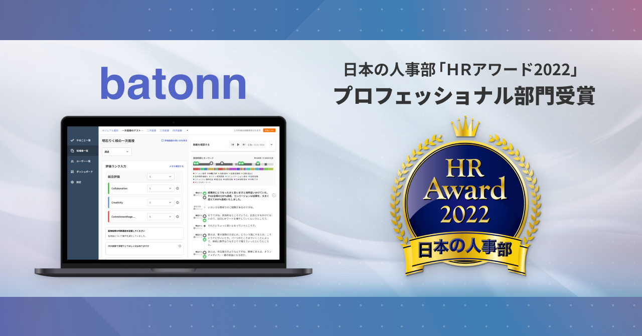 株式会社リブセンスが運営する、面接最適化クラウド『batonn(バトン)』(URL:https://batonn.io/)が、日本の人事部「HRアワード2022」(主催:「HRアワード」運営委員会、後援:厚生労働省)のプロフェッショナル部門へ、応募総数388件の中から入賞しました。