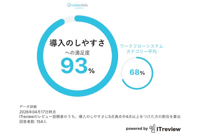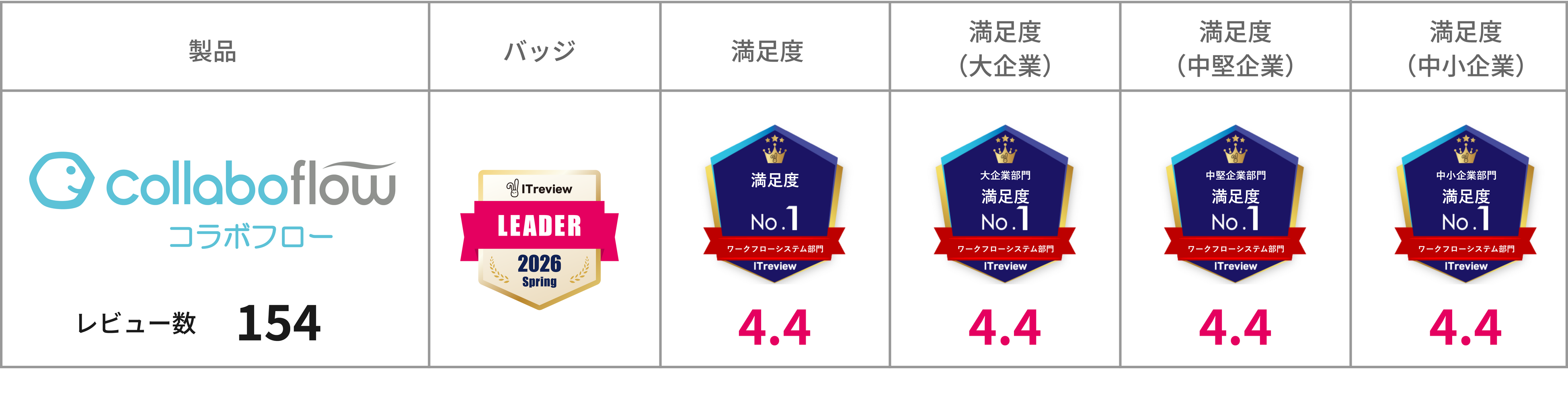 2026年3月末時点に掲載されたレビューを元に「ITreview カテゴリーレポート 2026 Spring」が発表され、コラボフローがワークフローシステム部門の20期連続「顧客満足度No.1」に選ばれました。