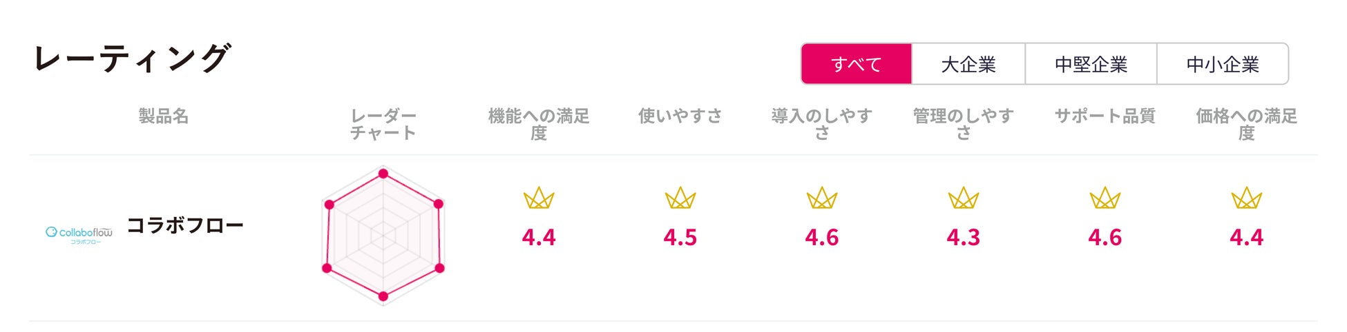 ユーザーから取得した価格・機能満足度・使いやすさ・サポートの品質などの評価項目において、コラボフローはレーティング全6項目でNo.1評価を獲得しました。