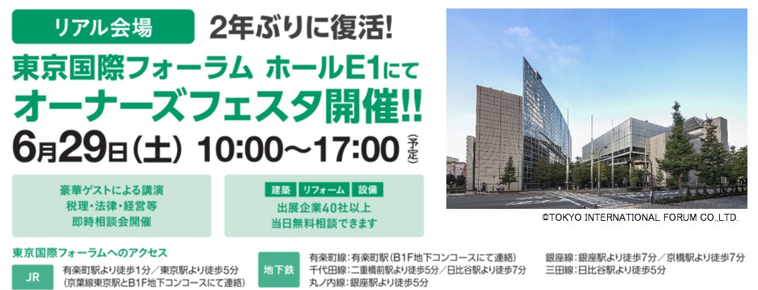 今回目玉となるリアル会場は、6月29日(土)に2年ぶりに東京国際フォーラムに会場を設け、有観客でのイベントを実施いたします。イベント会場、セミナー会場の2つの会場でのトークショーや専門家による講演、音楽家によるコンサートの他、「見て・聴いて・触れて」を体験できる出展コーナーをご用意。併せて、出展コーナーを訪問すると豪華賞品が当たるスタンプラリーも開催。「賃貸の未来をつなぐ」をテーマに今後の賃貸経営の展望や成功へのノウハウをお届けいたします。