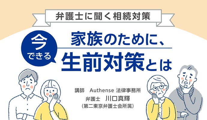 本セミナーでは、相続に関する案件を多く取り扱う当事務所の弁護士 川口 真輝が、「相続」を「争族」にしないための基礎知識や「自分の意志を家族に伝え続ける」ための具体的な生前対策について、解説いたします。