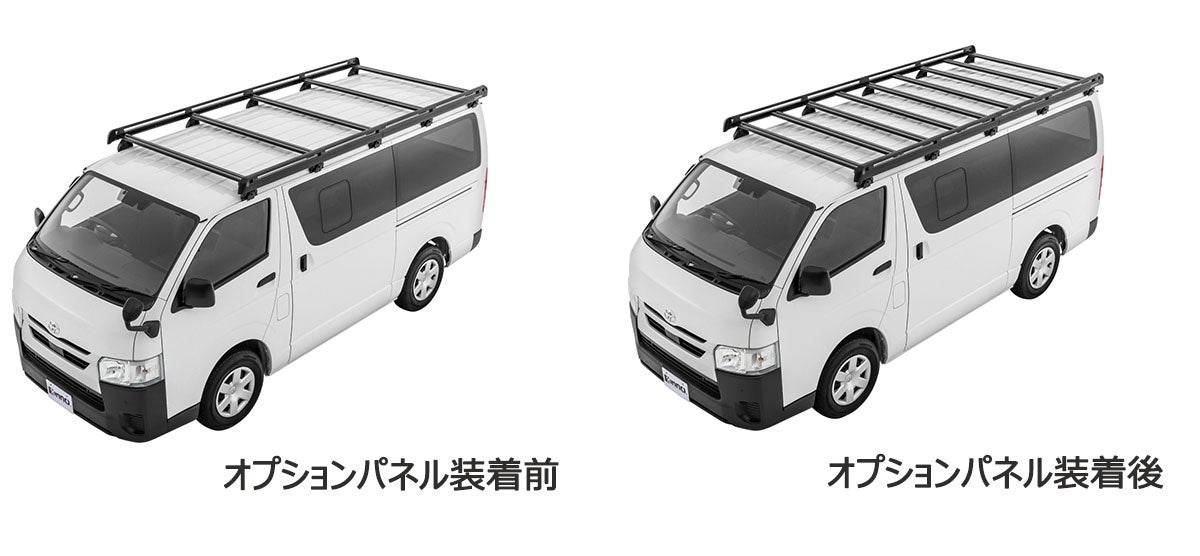 個人事業主など、ハイエースを乗用車としても使用しているユーザーへ向け、プライベートのアウトドア等でそのまま装着していても違和感のないブラックで統一。また、ベルトが通しやすい2段のサイドパネルを採用しました。