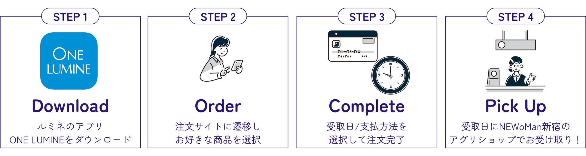 ONE LUMINEユーザーは特設の注文サイトからお好きな商品を選択し事前に決済を完了すると、受取日当日にNEWoMan新宿内指定の受け取りスポットにてスムーズに商品をお持ち帰りいただけます。さらに、ルミネカードでのお支払いでお買い上げ金額の5%オフ(ルミネカード10%オフキャンペーン期間中は10%オフ)が適用されるお得な機能を実装いたしました。