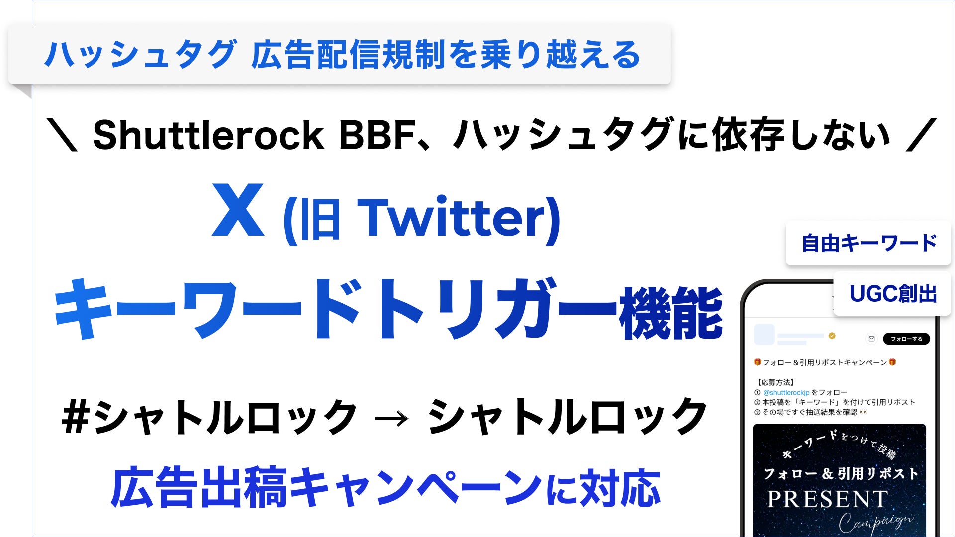 シャトルロックジャパン株式会社(本社:東京都新宿区、代表取締役:金光 展意、以下、シャトルロックジャパン)は、X (旧Twitter) におけるハッシュタグ付き広告の配信停止後も実施可能な、「キーワードトリガー型キャンペーン機能」の提供を開始したことをお知らせいたします。