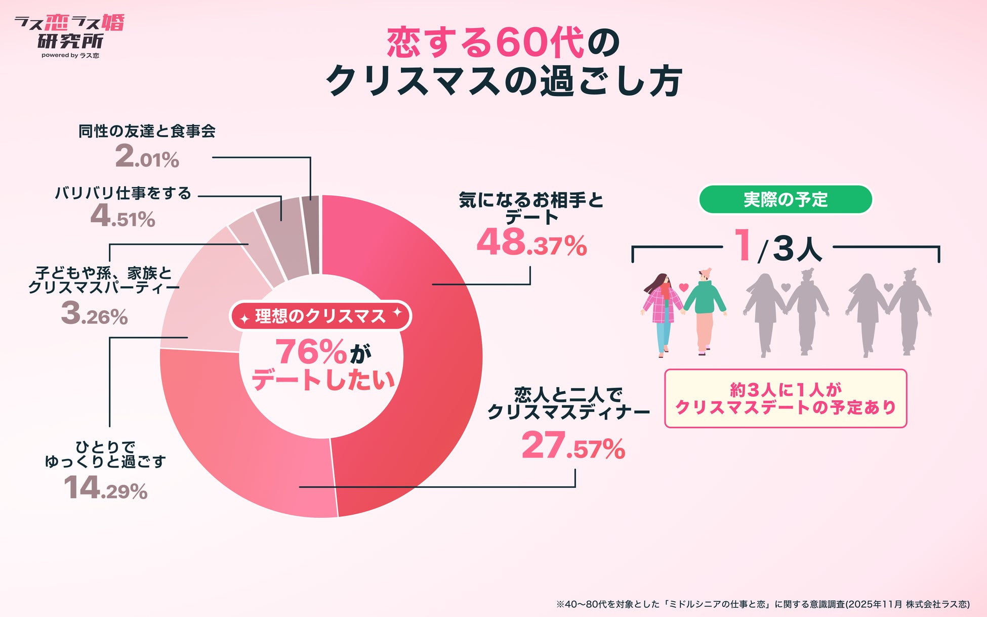 「クリスマスは若者のもの」という固定観念は、もう古いのかもしれません。中高年の恋や多様な生き方が、もっと自然に語られ、肯定される社会になってほしい。そんな想いを込めて、ラス恋はこれからも中高年の恋活を応援し、その実態を社会に発信し続けます。