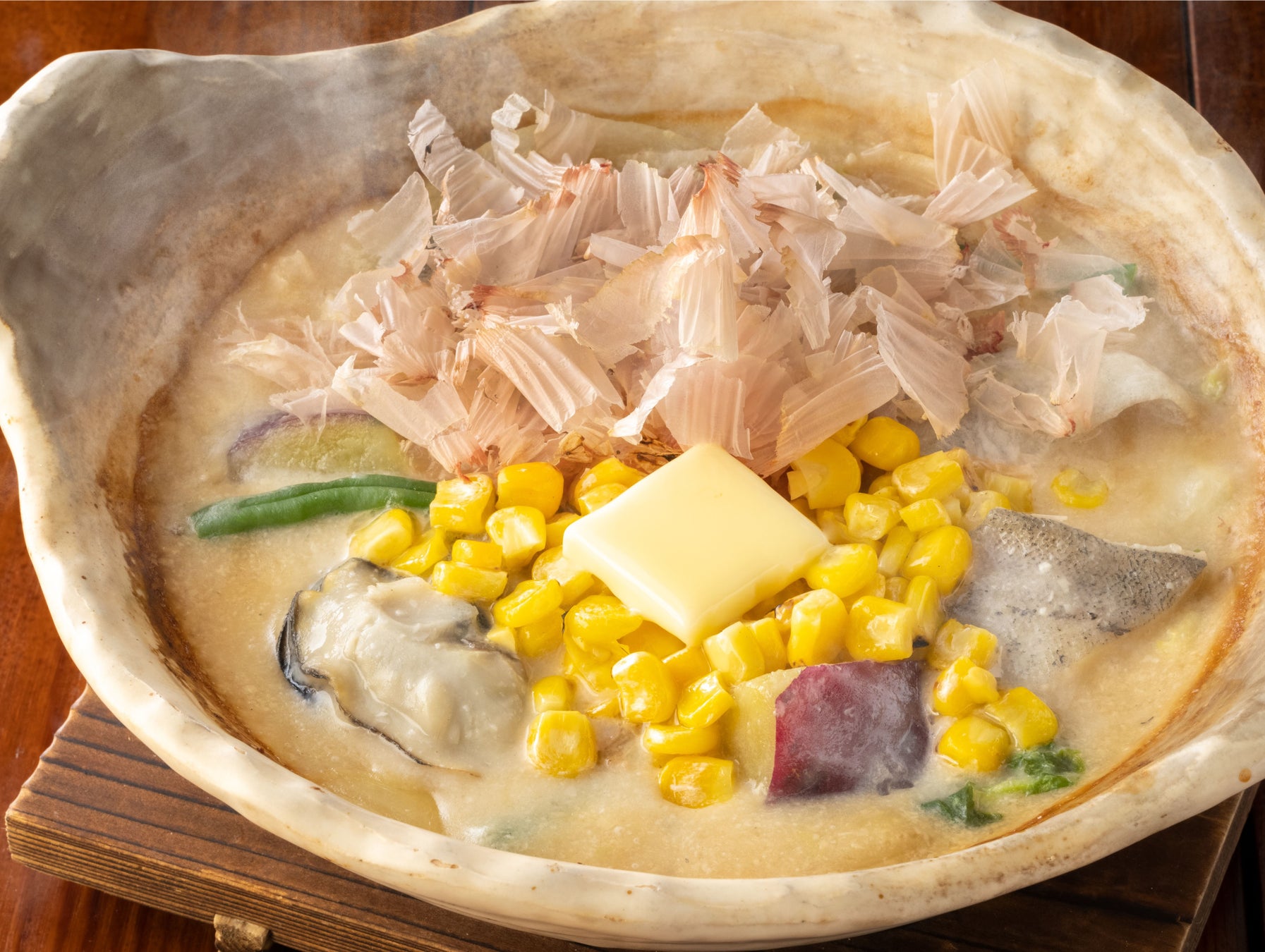 白味噌入りのクリームシチューに出汁と酒粕を加えた風味豊かな“和”の素材たっぷりのクリームシチュー。