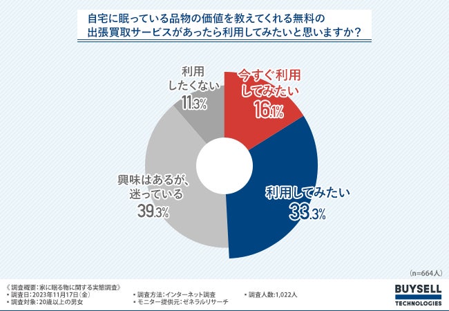 「自宅に眠っている品物の価値を教えてくれる無料の出張買取サービスがあったら利用してみたいと思いますか?」と質問したところ、「今すぐ利用してみたい(16.1%)」「利用してみたい(33.3%)」を合わせて、約半数が無料の出張買取サービスを利用したいと回答しました。
