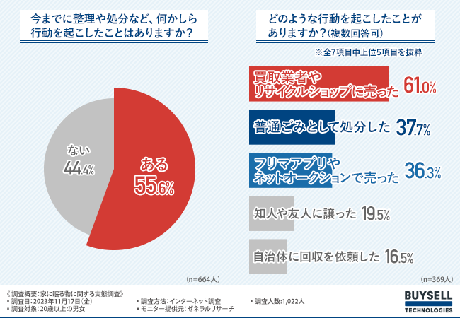 具体的に整理や処分など「どのような行動を起こしたことがありますか?(複数回答可)」と質問したところ、「買取業者やリサイクルショップに売った(61.0%)」が最も多く、次いで「普通ごみとして処分した(37.7%)」「フリマアプリやネットオークションで売った(36.3%)」と続きました。
