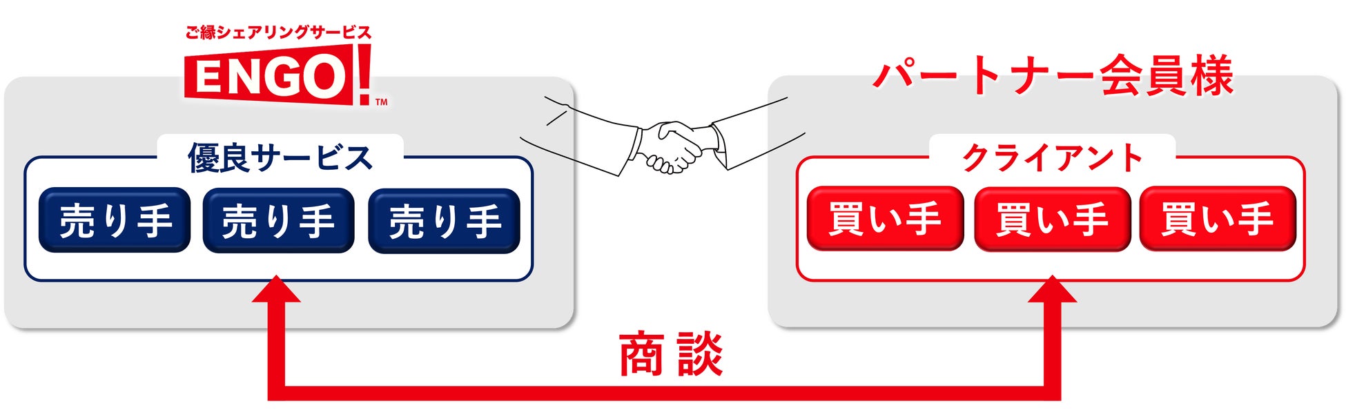 ENGOパートナー会員様には、ENGOが契約している上場企業をはじめとした「売り手企業」の優良サービスをクライアントにご紹介していただき、商談相手=「買い手企業」をお探しいただきます。