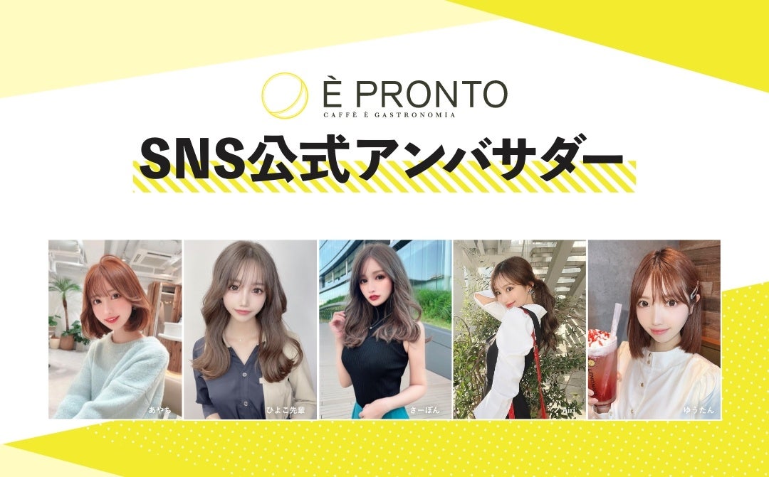 株式会社プロントコーポレーション(本社:東京都港区、代表取締役社長:竹村典彦)が展開する「È PRONTO(エプロント)」は、タレント・インフルエンサーなどとして活躍中の「あやち」「ひよこ先輩」「さーぽん」「Airi」「ゆうたん」の5名をエプロントSNS公式アンバサダーに起用することを決定いたしました。今後は、エプロントに関する最新情報をSNS公式アンバサダーのメンバーがお届けいたします。