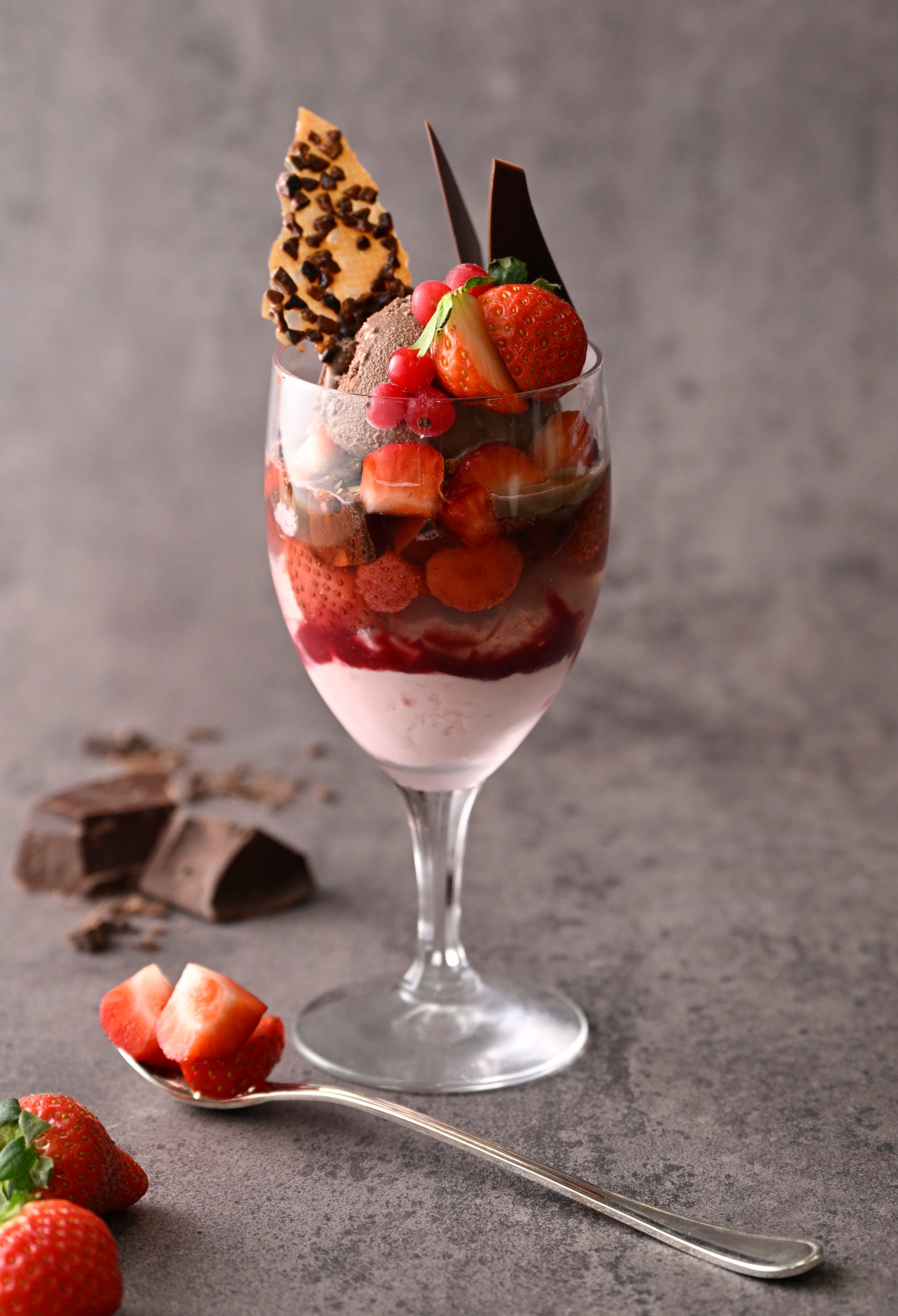 生チョコやブラウニー、北海道いちごのコンフィチュールを重ねた期間限定のパフェ。