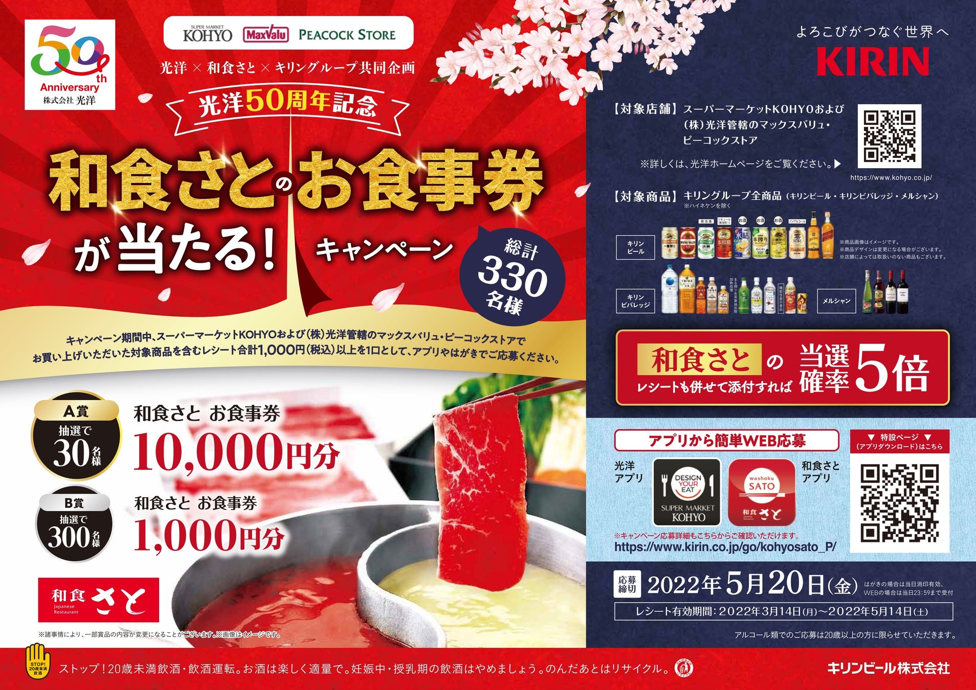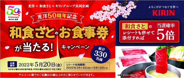 同キャンペーンでは、期間中にKOHYOや㈱光洋が運営するマックスバリュ、ピーコックなどの店舗で、『本麒麟』などKIRIN対象商品を含め税込1,000円以上購入し、応募はがきに会計レシートを貼付するか、和食さと・光洋アプリから応募すると、「和食さと お食事券」が合計330名様に当たるキャンペーンです。