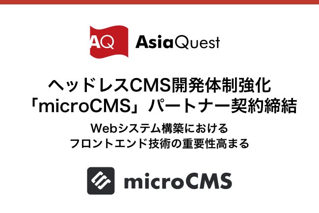 IoTやAIなどのデジタル技術を活用して企業のデジタルトランスフォーメーションを支援するアジアクエスト(本社:東京都千代田区)が、株式会社microCMS(本社:東京都千代田区、以下「microCMS」)のmicroCMSパートナープログラム制度において、microCMSパートナーとなりました。