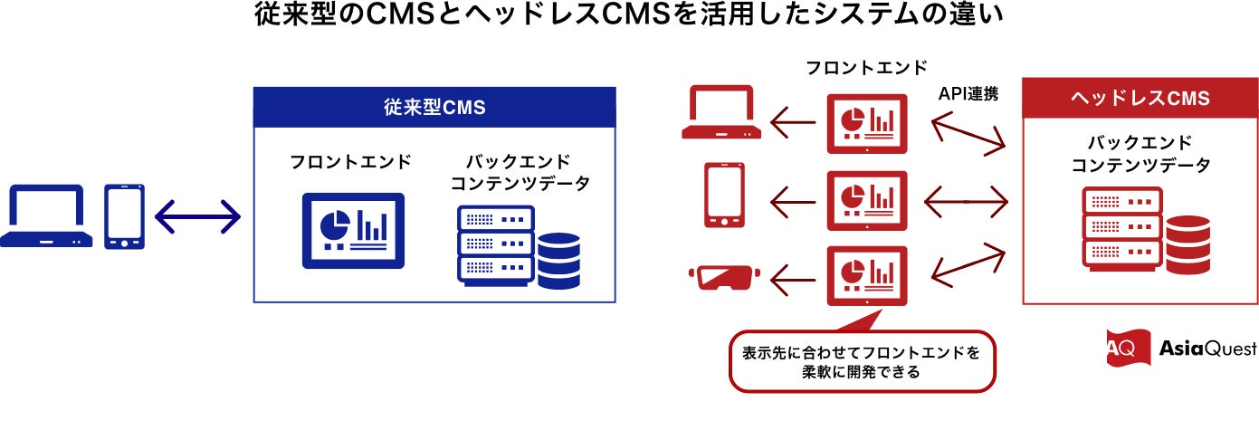 アジアクエストは、多様なCMSの選択肢を提供することでお客様のニーズへの最適化やフロントエンドとバックエンドの要件に応じた柔軟なWebシステム構築を実現します。