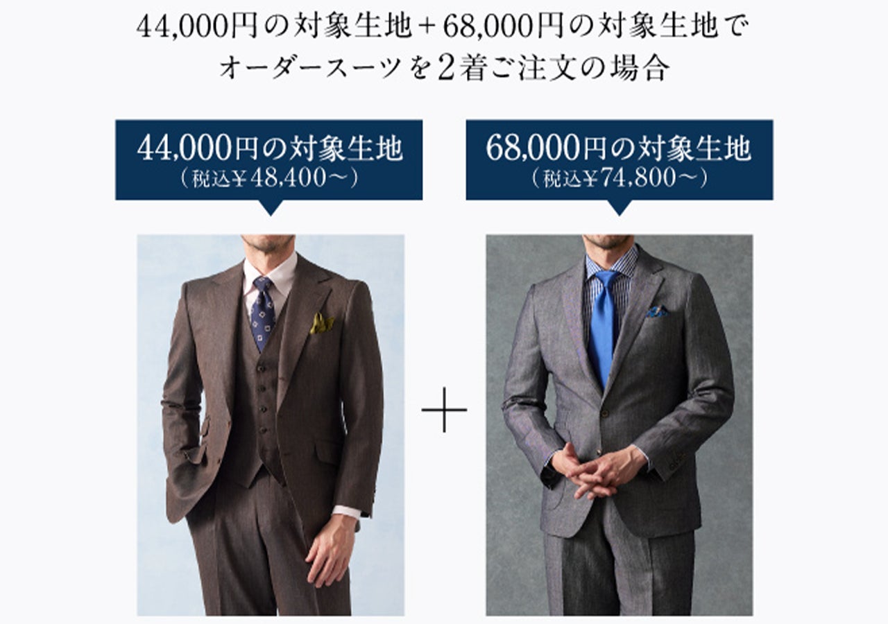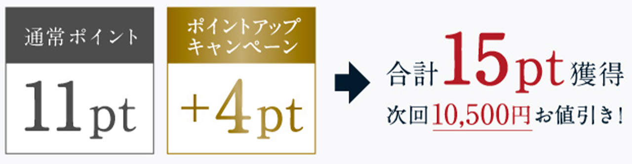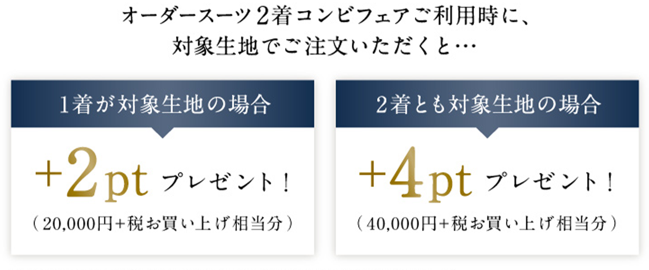 購入金額10,000円(税込11,000円)につき、+1ポイント。さらに!ポイントアップキャンペーンで対象生地1着購入するごとに+2ポイント追加