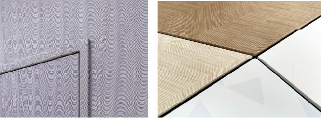また、ビニルクロスとの併用でデザインに統一感のあるコーディネートも。その他、フィルムを下地に直貼りするよりも容易なパネル加工* も可能です。展示会場でも見本を展示いたします。